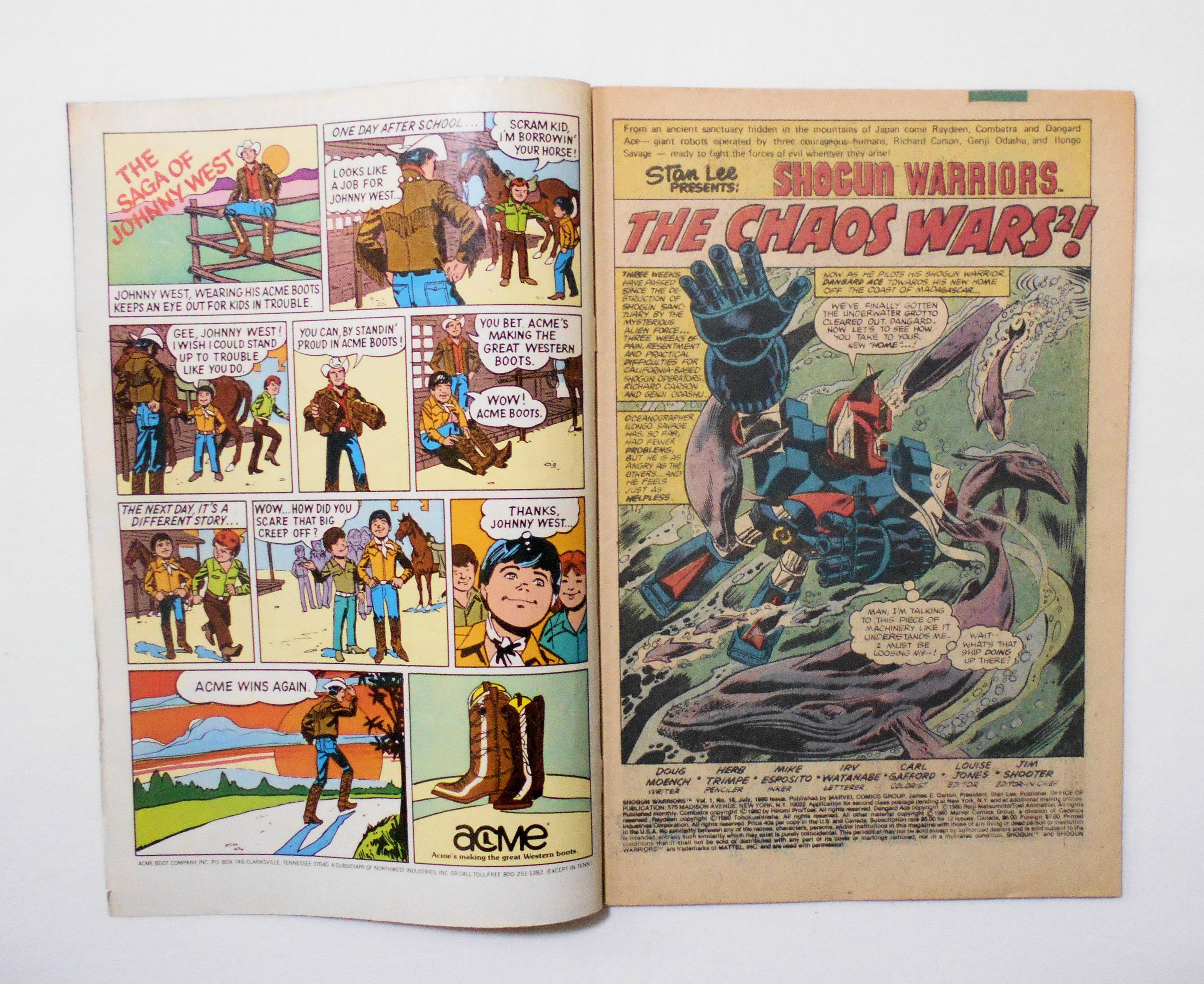 【SHOGUN WARRIORS ショーグン・ウォリアーズ】 VOL.1 NO.18 JULY 1980◆中古アメリカン・コミック。英文表記の洋書となります。◆32ページ カラー 大きさ約26×17センチ◆MARVEL COMIC GROUP◆HIROMI PRO/TOEI(東映)◆REIJI MATSUMOTO(松本零士)/TOEI ANIMATION(東映アニメーション)◆TOHOKUSHINSHA(東北新社)◆MATTEL,INC.◆米トイ・メーカー<マテル社>から発売された超合金シリーズ『ショーグン・ウォリアーズ』の人気にあやかり、マーベルより出版されたコミック・シリーズ。『惑星ロボ ダンガードA』、『勇者ライディーン』、『超電磁ロボ コン・バトラーV』が登場しますが、日本のアニメとは設定等が大幅に変更されたオリジナル・ストーリーです。