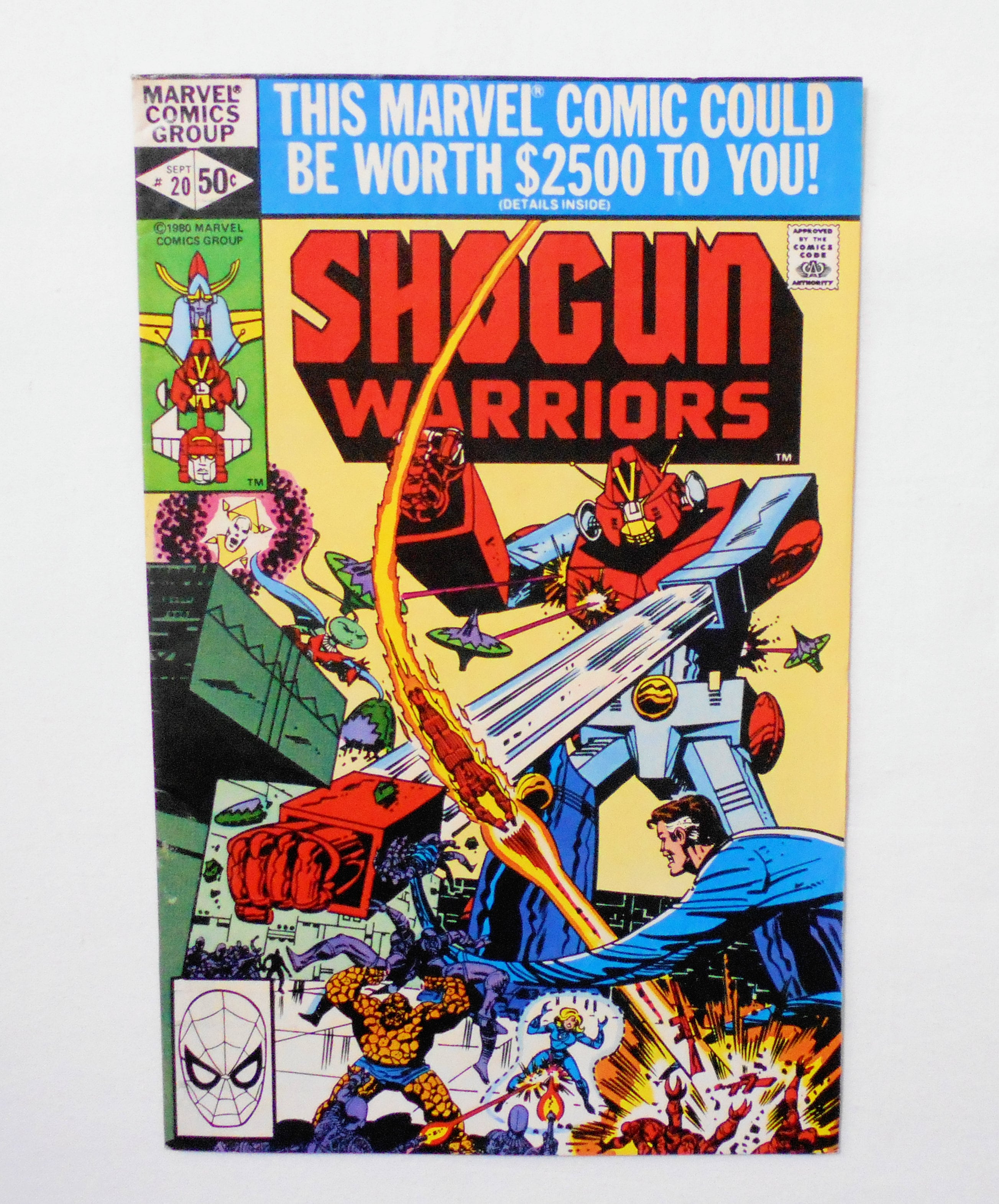【SHOGUN WARRIORS ショーグン・ウォリアーズ】 VOL.1 N0.20 SEPT. 1980◆#19とこの最終号の#20には、ゲストにファンタスティック・フォーが登場します。連載当初に比べ、発行部数が減ってきたことに加え、ファンタステック4との異色のクロスオーバーということで後年徐々にプレミアム化し、シリーズ中最も入手困難で、ダントツのプレミアム価格で取り引きされている#20です。◆中古アメリカン・コミック。英文表記の洋書となります。◆32ページ カラー 大きさ約26×17センチ◆MARVEL COMIC GROUP◆HIROMI PRO/TOEI(東映)◆REIJI MATSUMOTO(松本零士)/TOEI ANIMATION(東映アニメーション)◆TOHOKUSHINSHA(東北新社)◆MATTEL,INC.◆米トイ・メーカー<マテル社>から発売された超合金シリーズ『ショーグン・ウォリアーズ』の人気にあやかり、マーベルより出版されたコミック・シリーズ。『惑星ロボ ダンガードA』、『勇者ライディーン』、『超電磁ロボ コン・バトラーV』が登場しますが、日本のアニメとは設定等が大幅に変更されたオリジナル・ストーリーです。