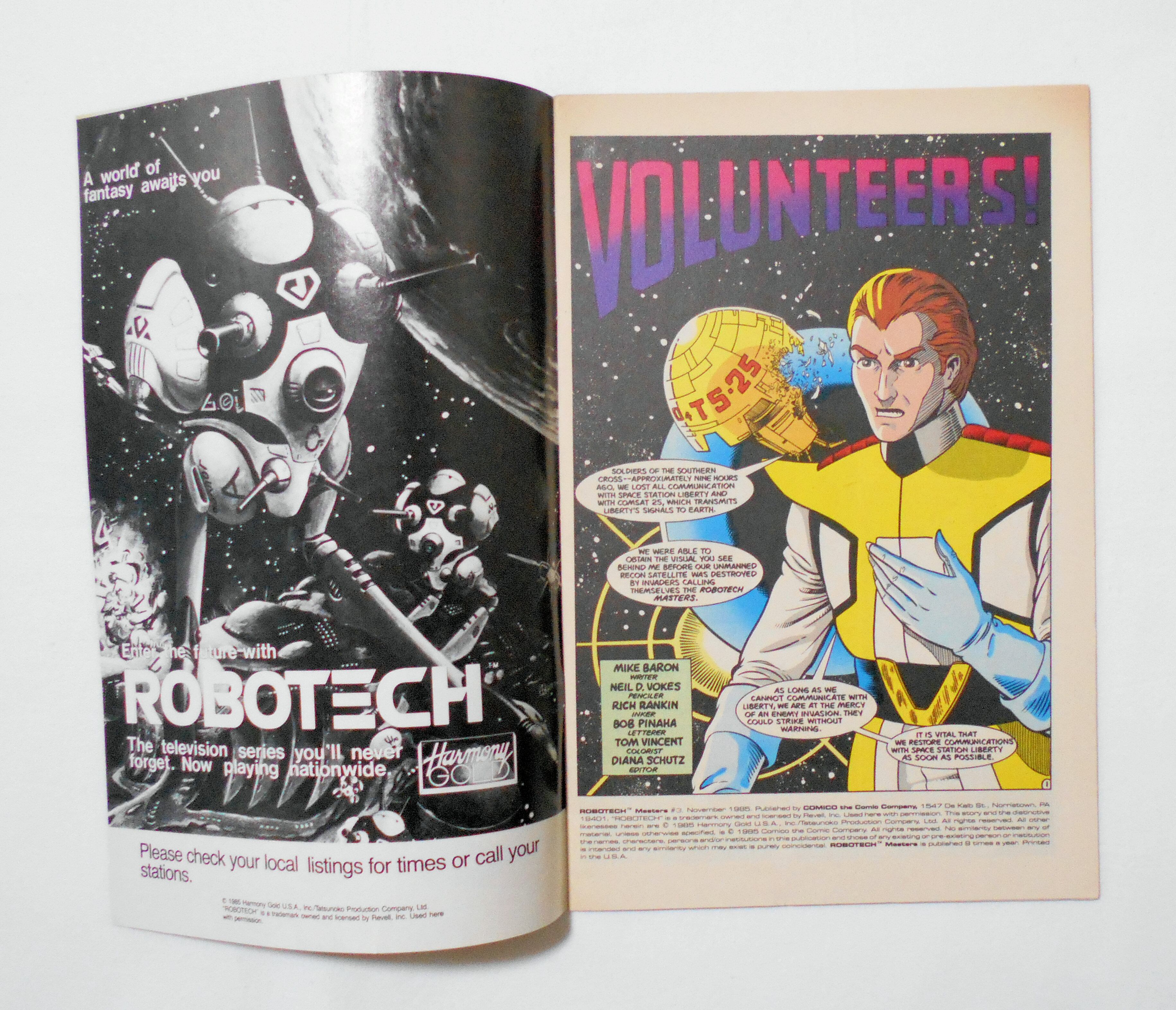 【ROBOTACH MASTERS (ロボテック・マスターズ)】 #3 NOV. 1985◆中古アメリカン・コミック。英文表記の洋書となります。◆竜の子プロダクション(タツノコプロ)製作の『超時空要塞マクロス』、『超時空騎団サザンクロス』、『機甲創世記モスピーダ』の3作品を、アメリカでの権利を獲得したハーモニーゴールドUSA (Harmony Gold USA)が再編集したコミック【ROBOTECH】シリーズです。◆32ページ カラー 大きさ約26×17センチ◆COMICO THE COMIC COMPANY◆HARMONY GOLD USA,INC.◆TATSUNOKO PRODUCTION COMPANY(竜の子プロダクション/タツノコプロ)