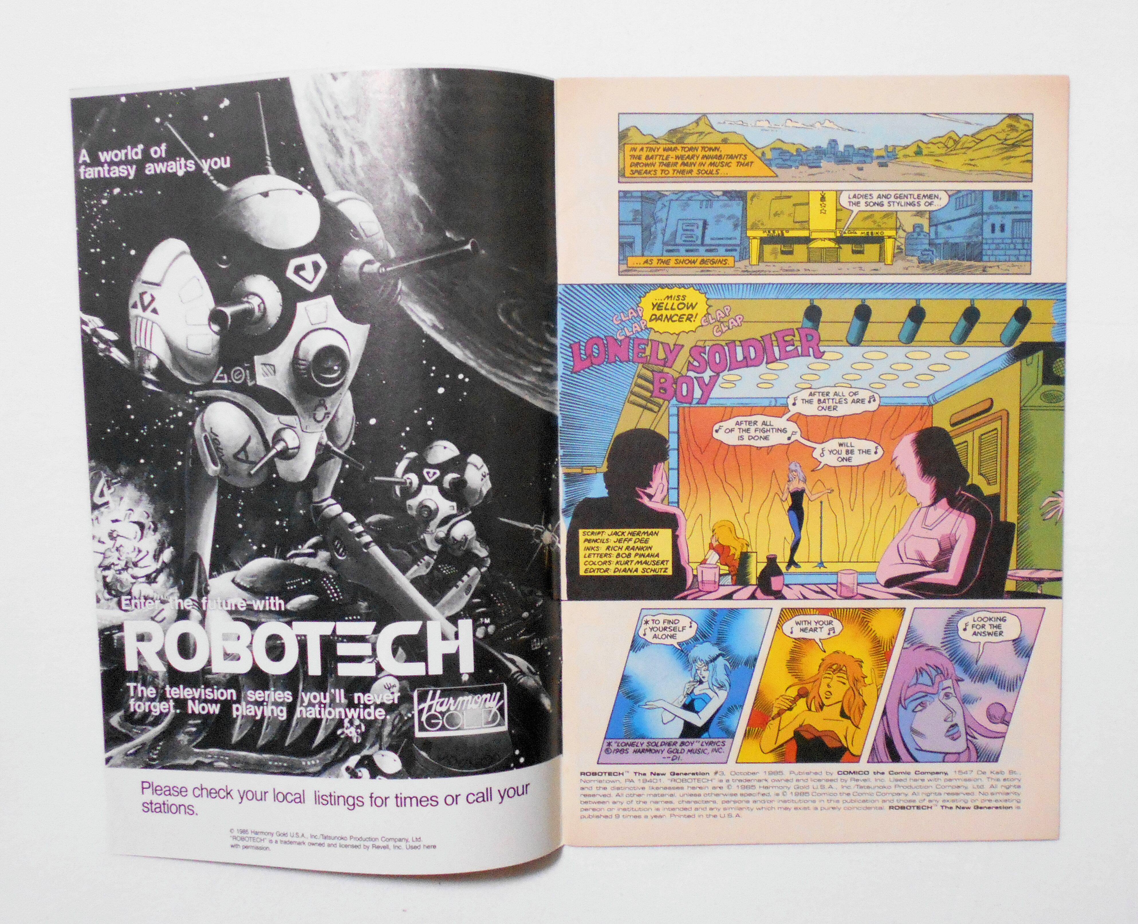 【ROBOTECH THE NEW GENERATION (ロボテック・ザ・ニュージェネレーション)】 #3 OCT. 1985◆中古アメリカン・コミック。英文表記の洋書となります。◆竜の子プロダクション(タツノコプロ)製作の『超時空要塞マクロス』、『超時空騎団サザンクロス』、『機甲創世記モスピーダ』の3作品を、アメリカでの権利を獲得したハーモニーゴールドUSA (Harmony Gold USA)が再編集したコミック【ROBOTECH】シリーズです。◆32ページ カラー 大きさ約26×17センチ◆COMICO THE COMIC COMPANY◆HARMONY GOLD USA,INC.◆TATSUNOKO PRODUCTION COMPANY(竜の子プロダクション/タツノコプロ)