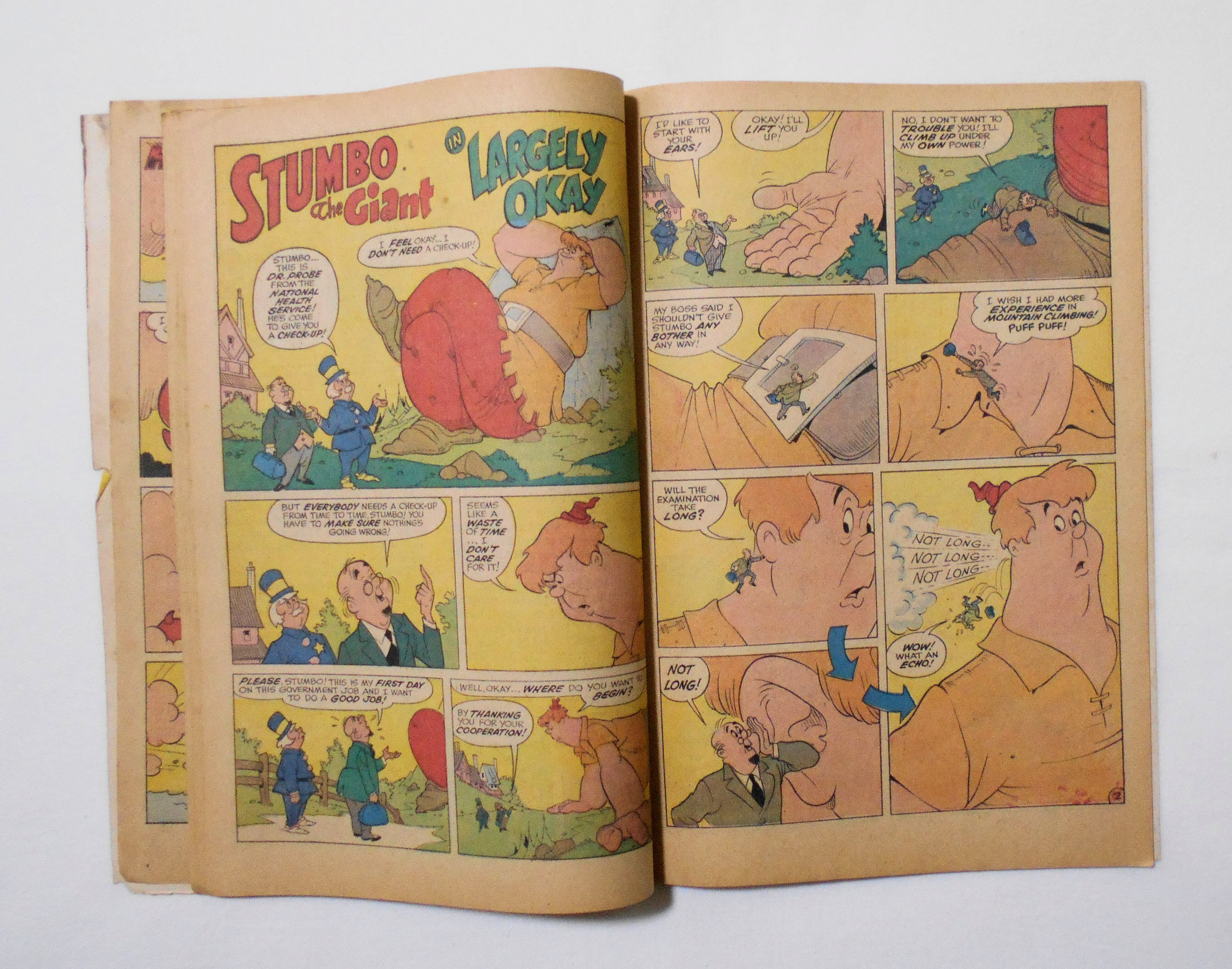 ページ数が44ページしかなく、当時のジャイアントサイズは48ページのはずで、添付写真4枚目の間のページ、2枚(4ページ)が紛失していると思います。また、その4枚目の写真の左ページの背部分の下半分が破れ、取れかかっています。他、多少の擦れやシワ、黄ばみ、角や端の傷みや折れ、破れ等があり、経年に伴う使用感は強めで、保存状態は良くありません。1971年のの輸入中古コミックですので、その点を考慮頂ければと思います。表紙の上端や、多少のシミ汚れはございますが、ページの殆どの部分は目立った汚れやシミ等はなく、読むのに支障はございません。新品同様の美品をお求めの方や、古書にご理解を頂けない方にお薦めは出来ません。
