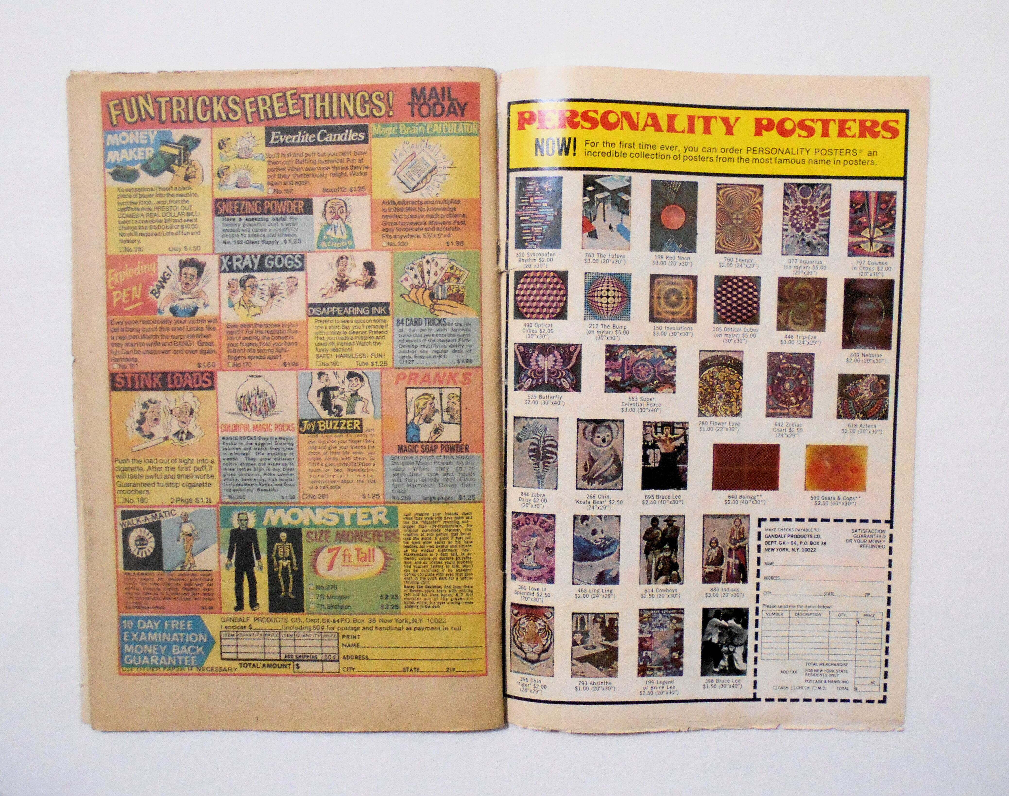 表紙のホッチキス部分が破れ、本体と外れた為、内側をテープで留め補修されています。表紙にガギガギとペン(鉛筆???)で落書きされており、中にも複数箇所色鉛筆や鉛筆等による落書きアリ。読むのに支障はない程度のものだと思います。他、多少の擦れやシワ、黄ばみ、角や端の傷みや折れ、破れ等があり、経年に伴う使用感は強めで、保存状態は悪いです。やんちゃなお子さんが読み親しんだ1970年代の輸入中古コミックですので、その点を考慮頂ければと思います。中は多少黄ばんでおり、前述のとおり複数個所落書きはありますが、目立った汚れやシミ等はなく、読むのに支障はございません。新品同様の美品をお求めの方や、中古品にご理解が頂けない方にはお薦め出来ません。