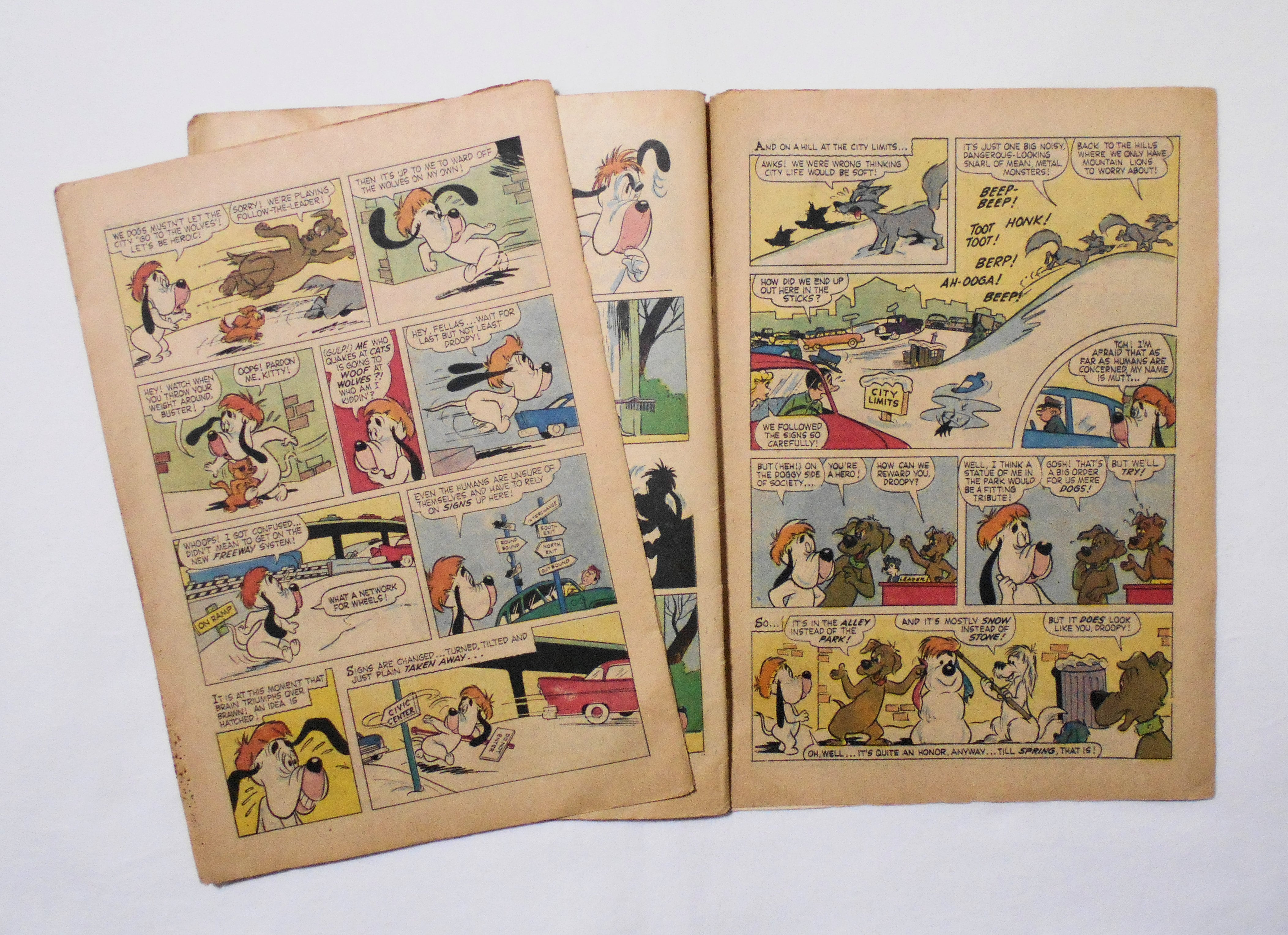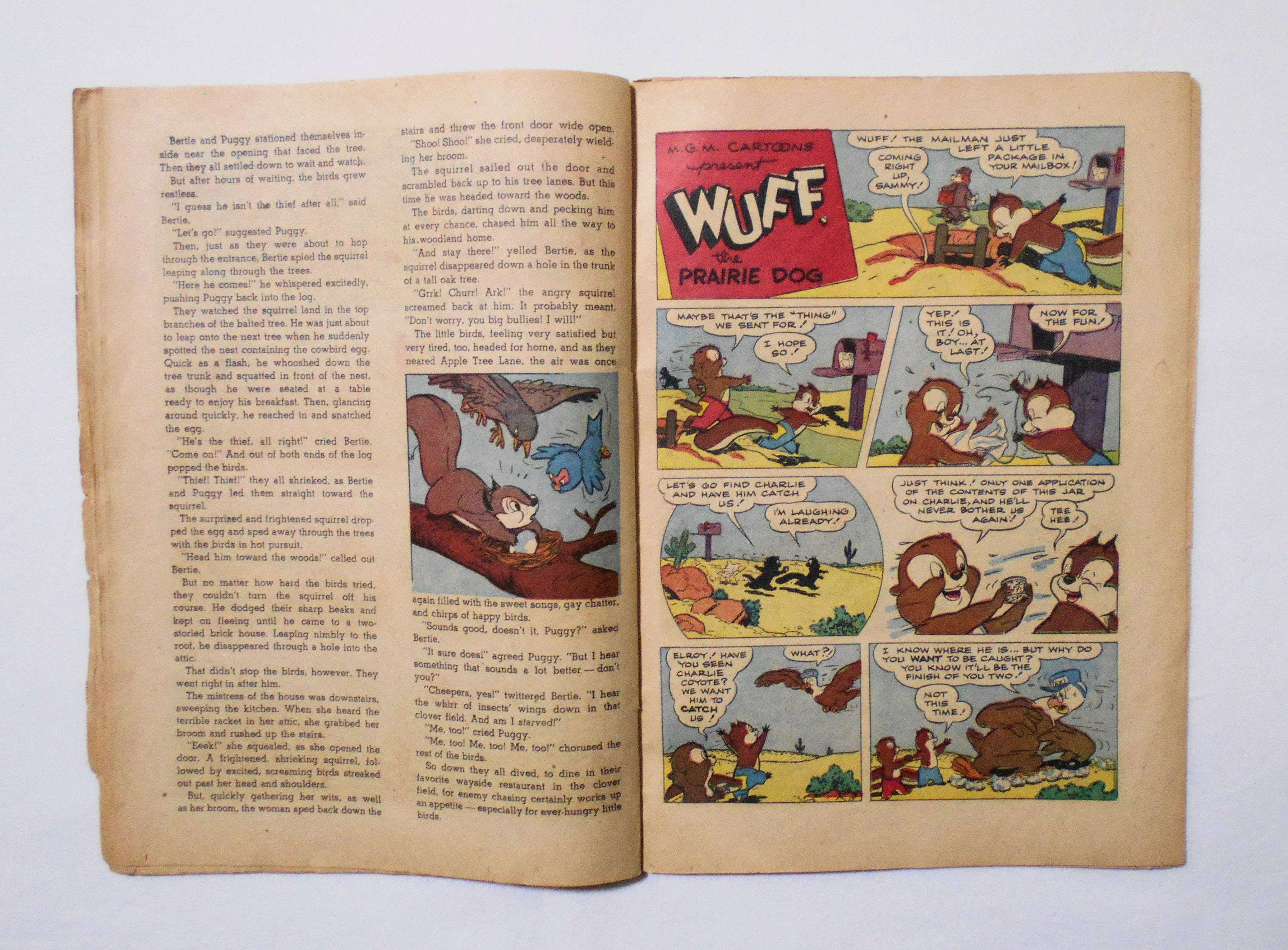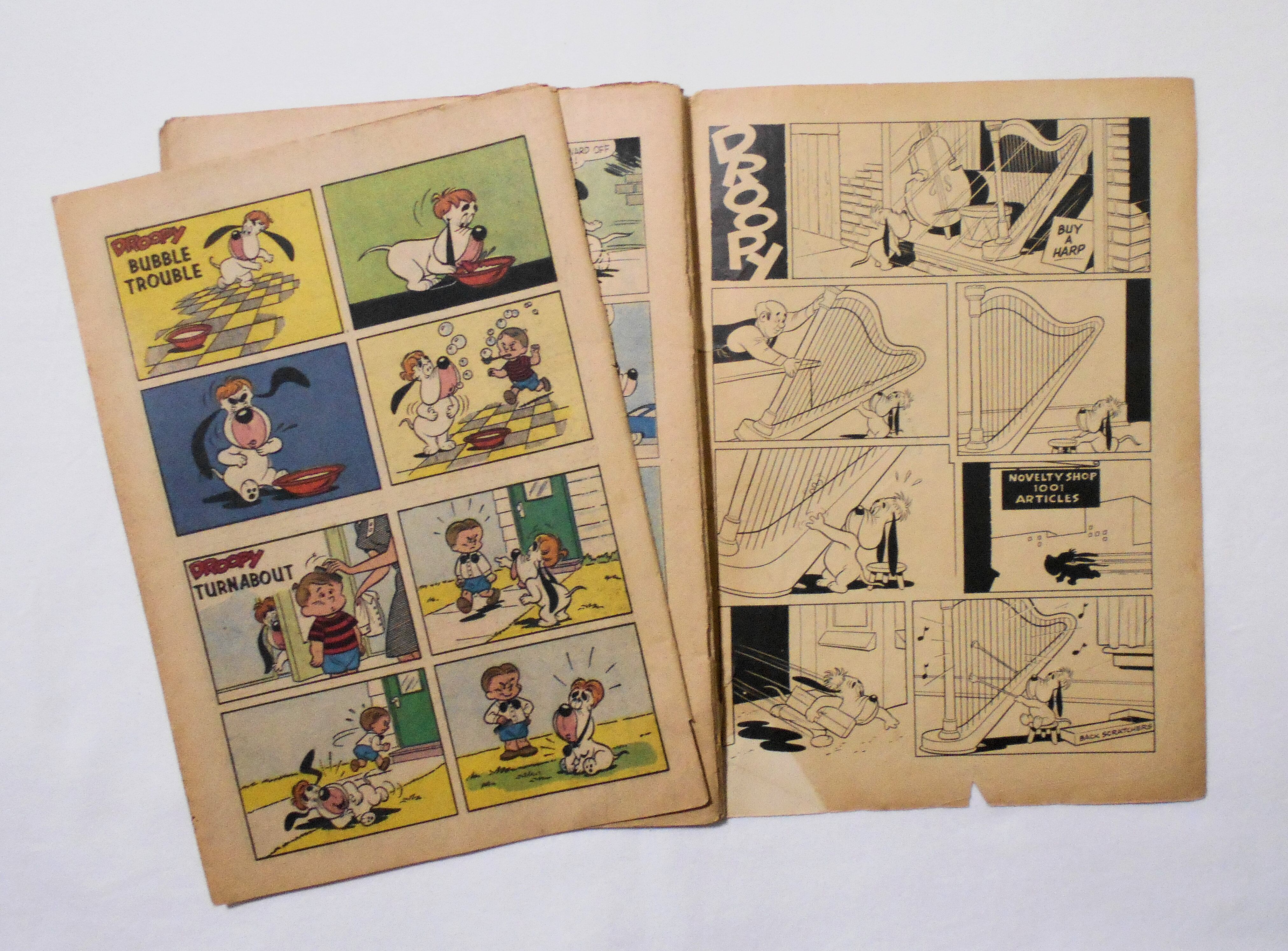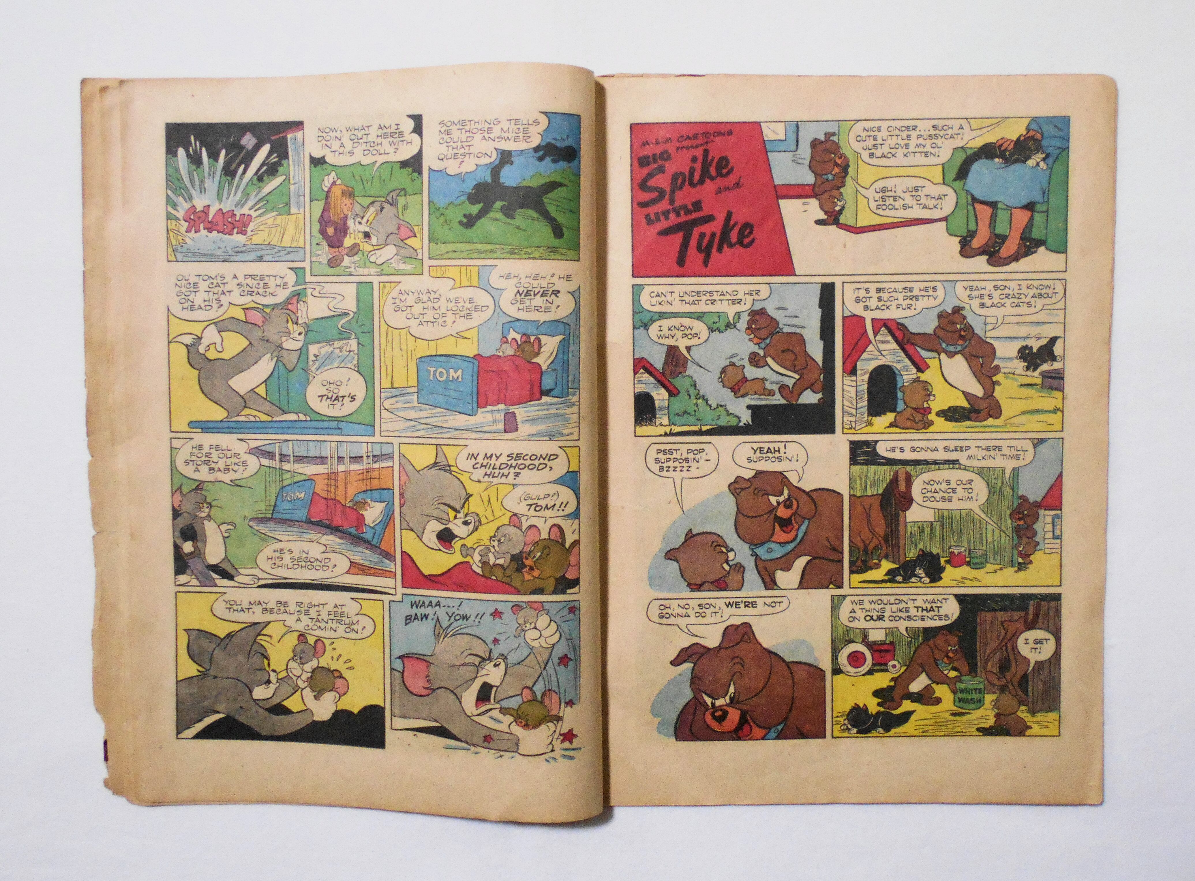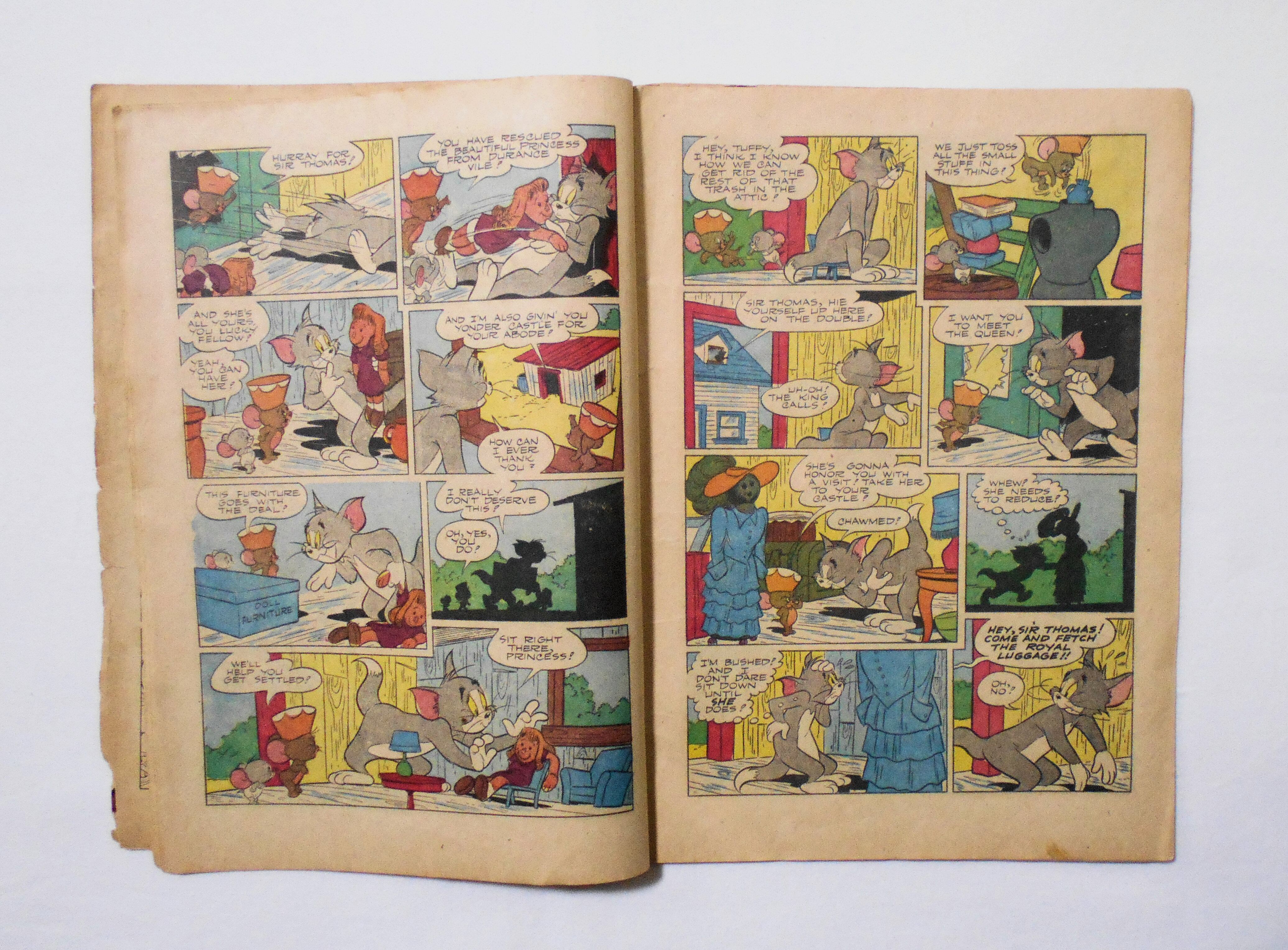 最後の3枚が本体から外れており、その3枚分の前半ページ3枚が紛失しています。おそらく中央見開きページも紛失しています。[この年代のこのシリーズのコミックは48ページのはずですので、前半3枚6ページ分+中央見開きページ4ページ分、合計10ページ分が紛失したページの全てだと思います]。他、多少の擦れやシワ、黄ばみ、紙ジミ、落書き(表紙のトムの耳に少し)、角や端の傷みや折れ、破れ等があり、経年に伴う使用感はかなり強めで、保存状態は悪いです。1950年代の輸入中古コミックですが、その点を考慮頂いてもコンディションは良くない方です。ただ、中は黄ばんでおり、多少のシミはございますが、目立った汚れやシミ等はなく、おおむねきれいな状態ですので、読むのに支障はございません。美品をお求めの方や、古書にご理解を頂けない方、また旧い本特有の匂いも多少しますので、気になる方にお薦めは出来ません。予めご了承くださいませ。