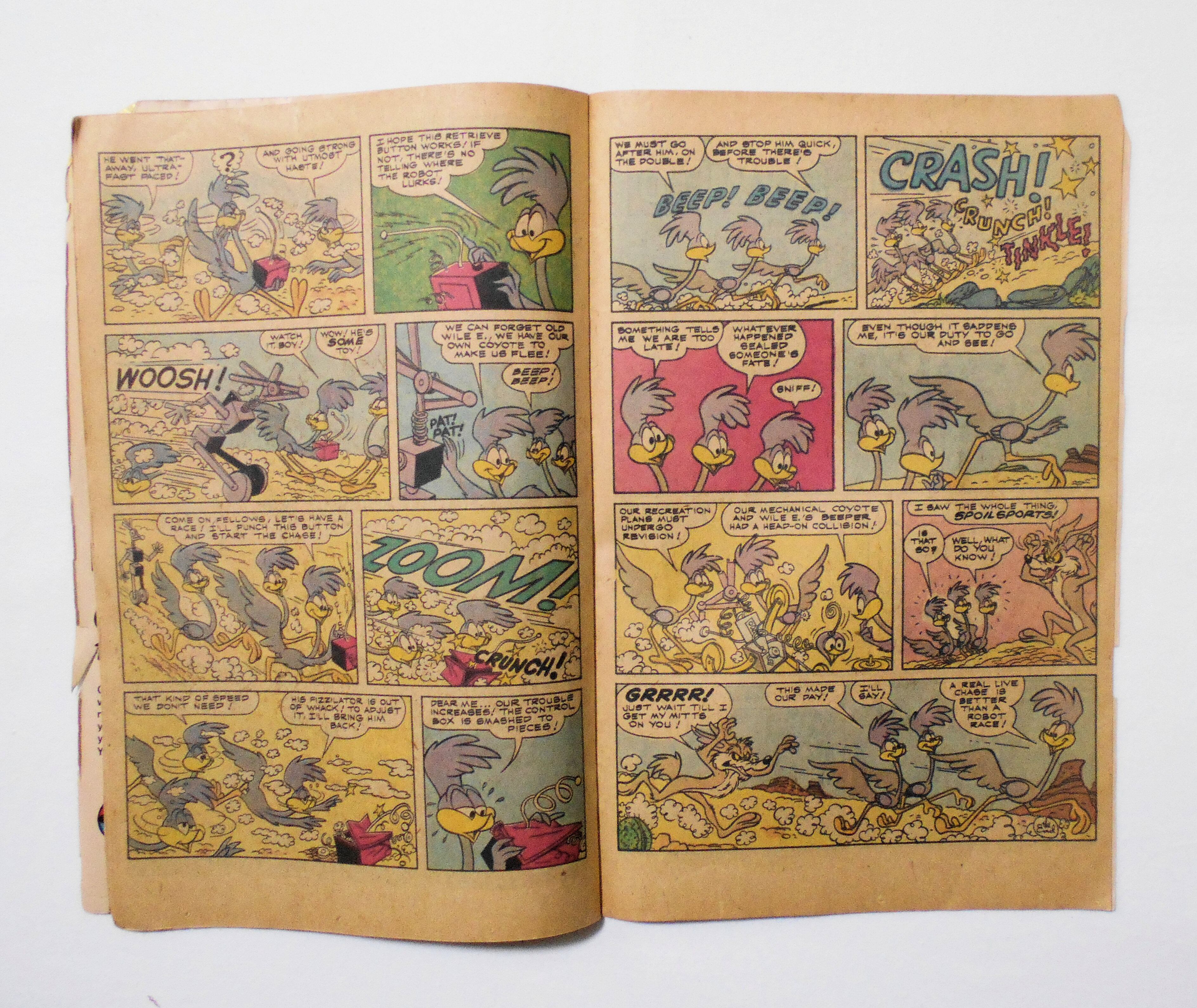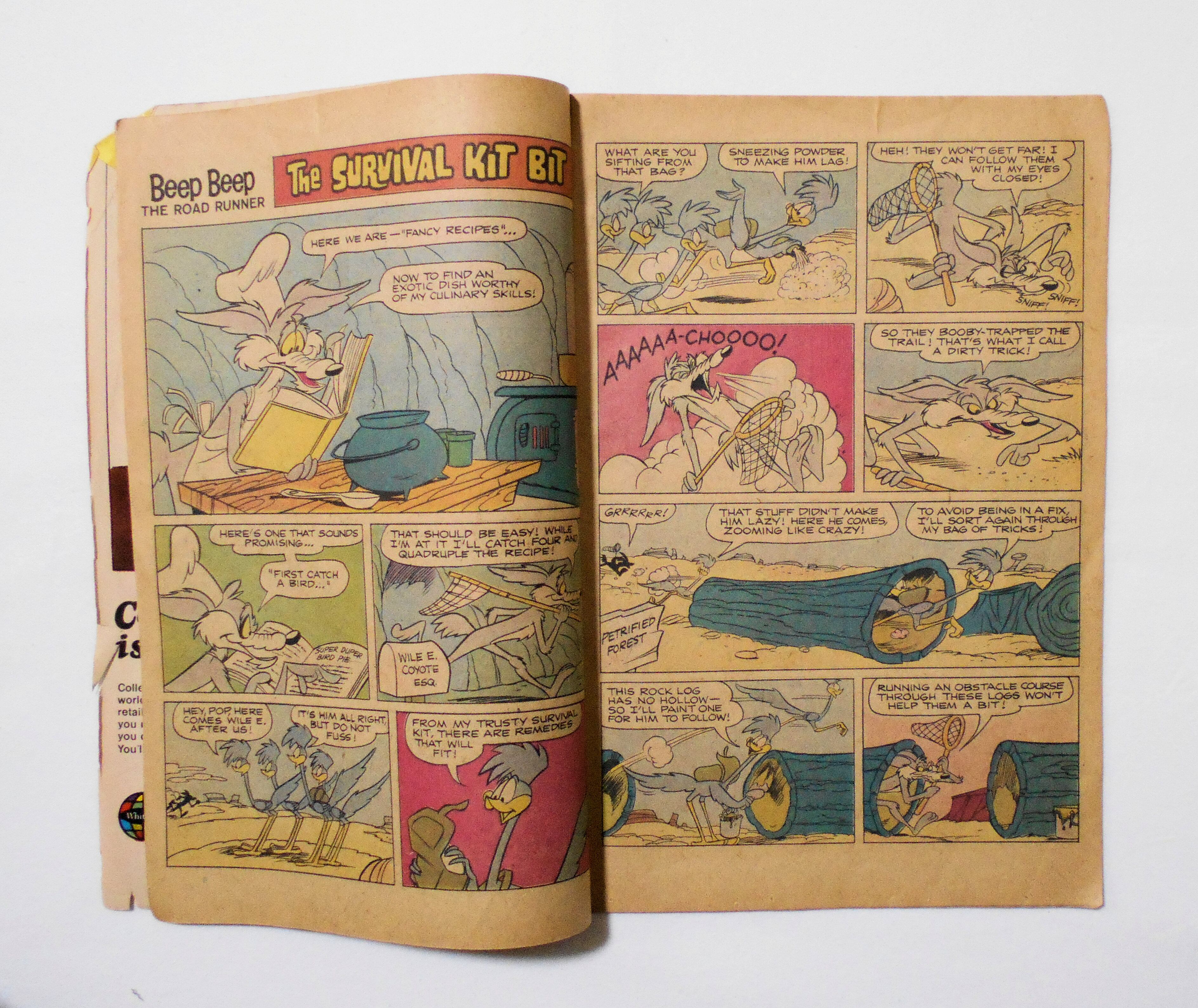 多少の擦れやシワ、黄ばみ、紙ジミ、角の傷みや折れ、破れ等があり、表紙の周辺の傷みが目立ち、経年に伴う使用感は強めで、保存状態は良くありません。1970年代の輸入中古コミックですので、その点を考慮頂ければと思います。中は黄ばんでいますが、目立った汚れやシミ等はなく、おおむねきれいな状態ですので、読むのに支障はございません。新品同様の美品をお求めの方や、中古品にご理解を頂けない方にお薦めは出来ません。*写真撮影時は、小口側端のロードランナーの足先部分の折れている部分がギリギリ付いておりましたが、現物では折り目に沿って三角形の形で約1×2センチ程が切れてしまいました。