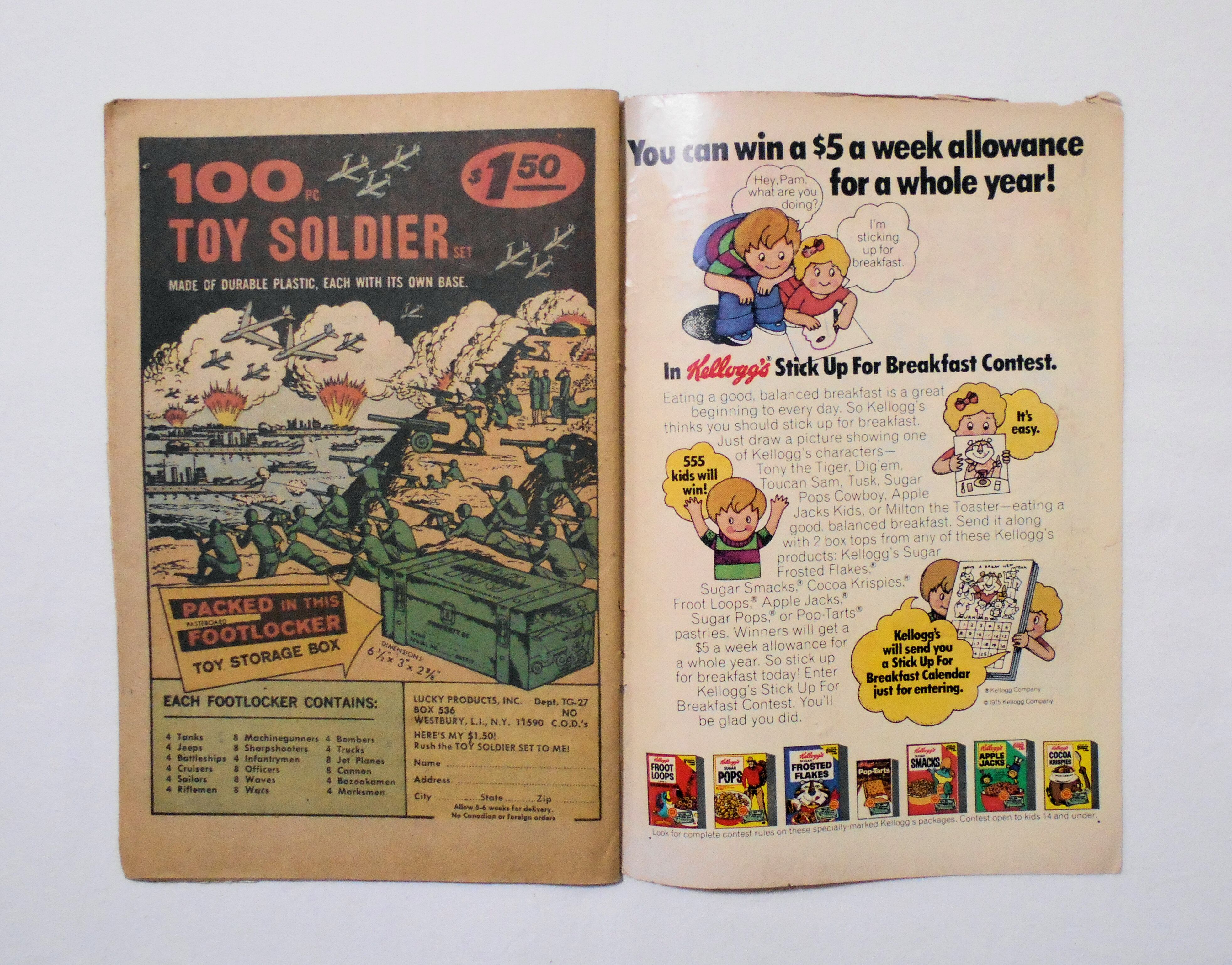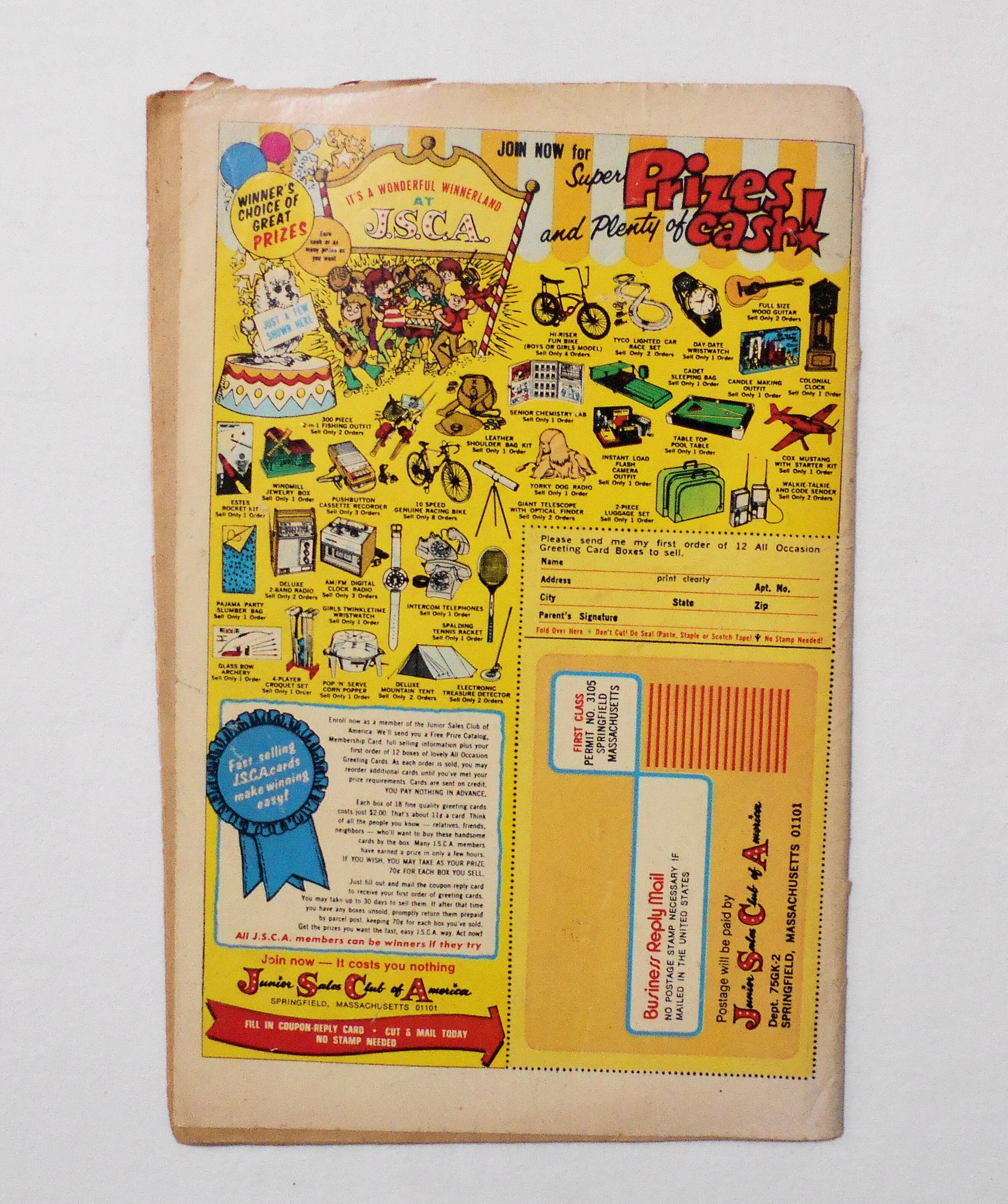 表紙の下端が大きく破れ紛失しています。背の中心が斜めにズレており、本全体に歪みが生じています。表紙のタイトル右あたりに汚れが付着しています。他、多少の擦れやシワ、黄ばみ、紙ジミ、角の傷みや折れ、破れ等があり、経年に伴う使用感は強めで、保存状態は悪いです。1970年代の輸入中古コミックですが、その点を考慮頂いても、保存状態は悪い方だと思います。ただ、中は黄ばんでいますが、目立った汚れやシミ等はなく、おおむねきれいな状態ですので、読むのに支障はございません。新品同様の美品をお求めの方や、中古品にご理解を頂けない方にお薦めは出来ません。