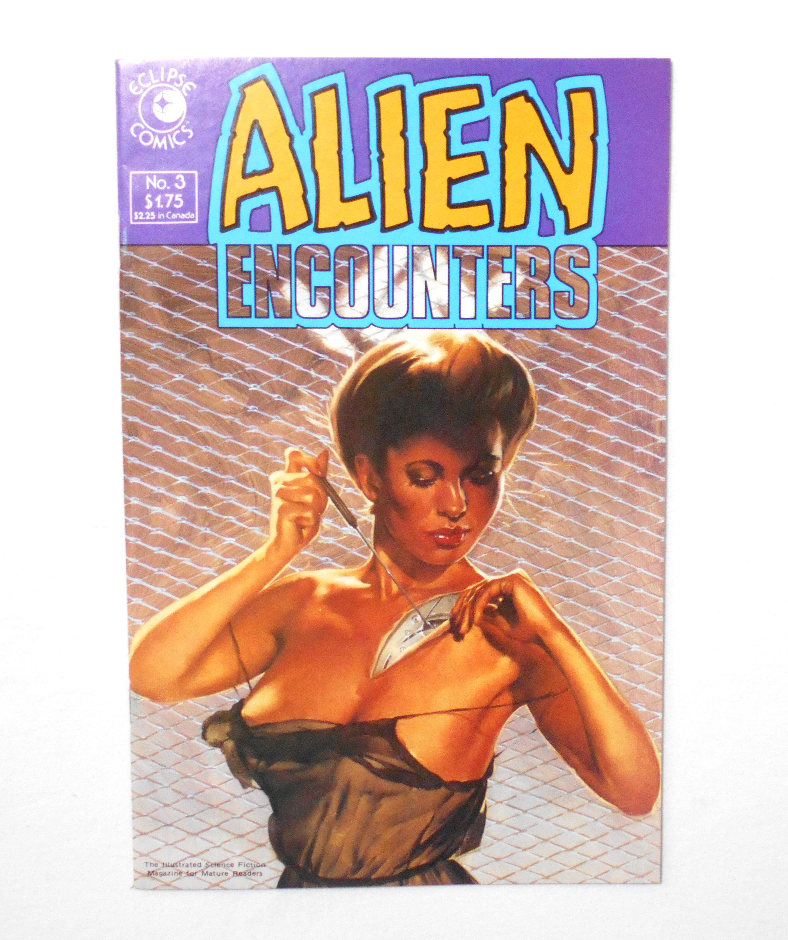 【ALIEN ENCOUNTERS】NO.3 OCT. 1985◆THE ILLUSTRATED SCIENCE FICTION MAGAZINE FOR MATURE READERS◆中古アメリカン・コミック。英文表記の洋書となります。◆32ページ カラー 大きさ約26×17センチ◆ECLIPSE COMICS◆収録タイトル: THE HEROINE by JMES BROCK, MOTHER KNOWS BEST by DIXON/ELMORE, CLAUSTROPHOBIA by HENRY/BAIKIE, RELATIVITY by ALEXANDER/MICHEIUZZI, COVER ART by MICK AUSTIN