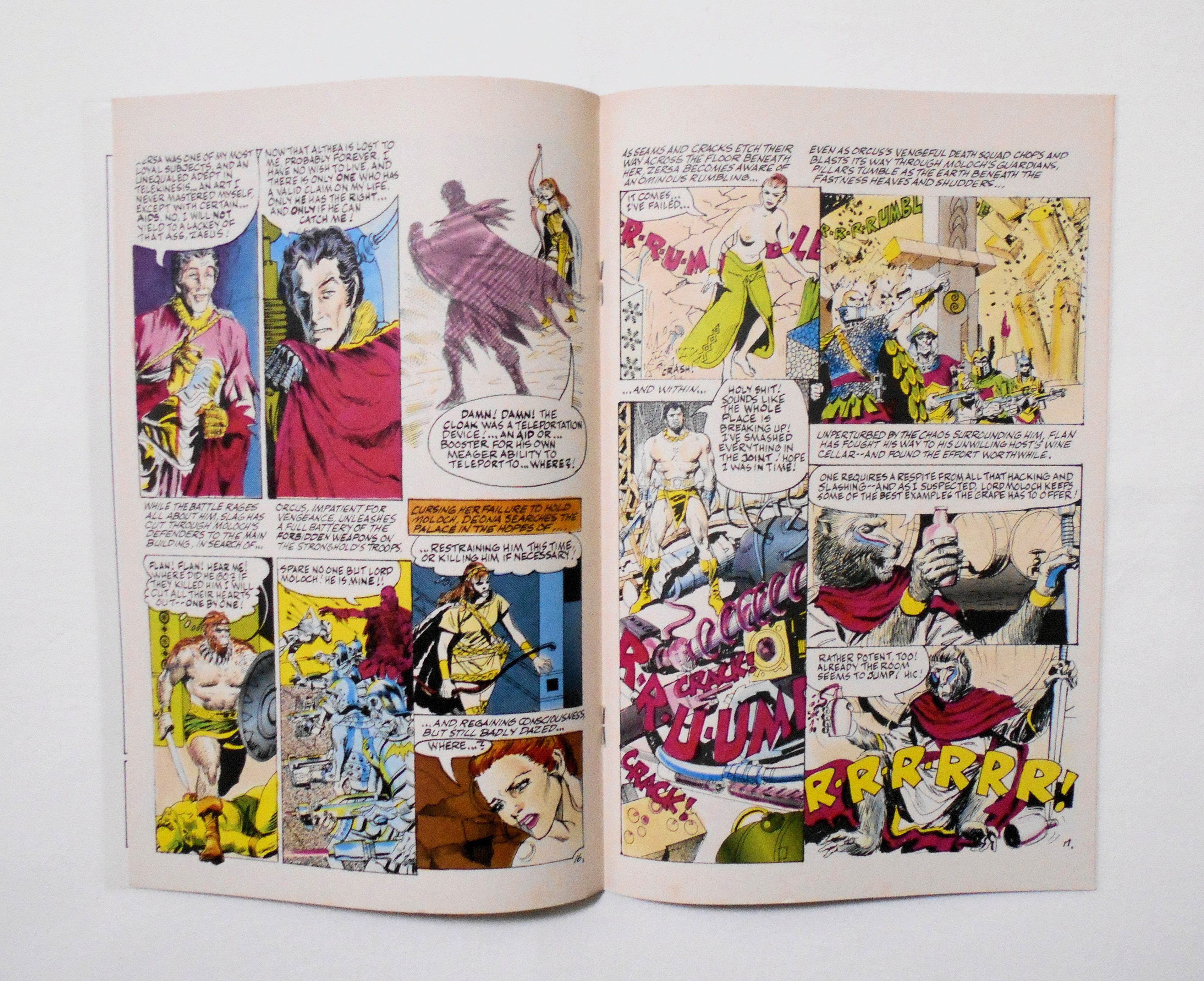 背から内側へ約1センチ縦方向に軽く折れ目が付いています。他、多少の擦れやシワ、黄ばみ、角や端の傷みや微折れ等があり、経年に伴う使用感は否めませんが、目立った汚れやシミ等はなく、1980年代の輸入中古コミックですので、その点を考慮頂ければ、普通程度~おおむねきれいな状態だと思います。新品同様の美品をお求めの方や、中古品にご理解が頂けない方にはお薦め出来ません。