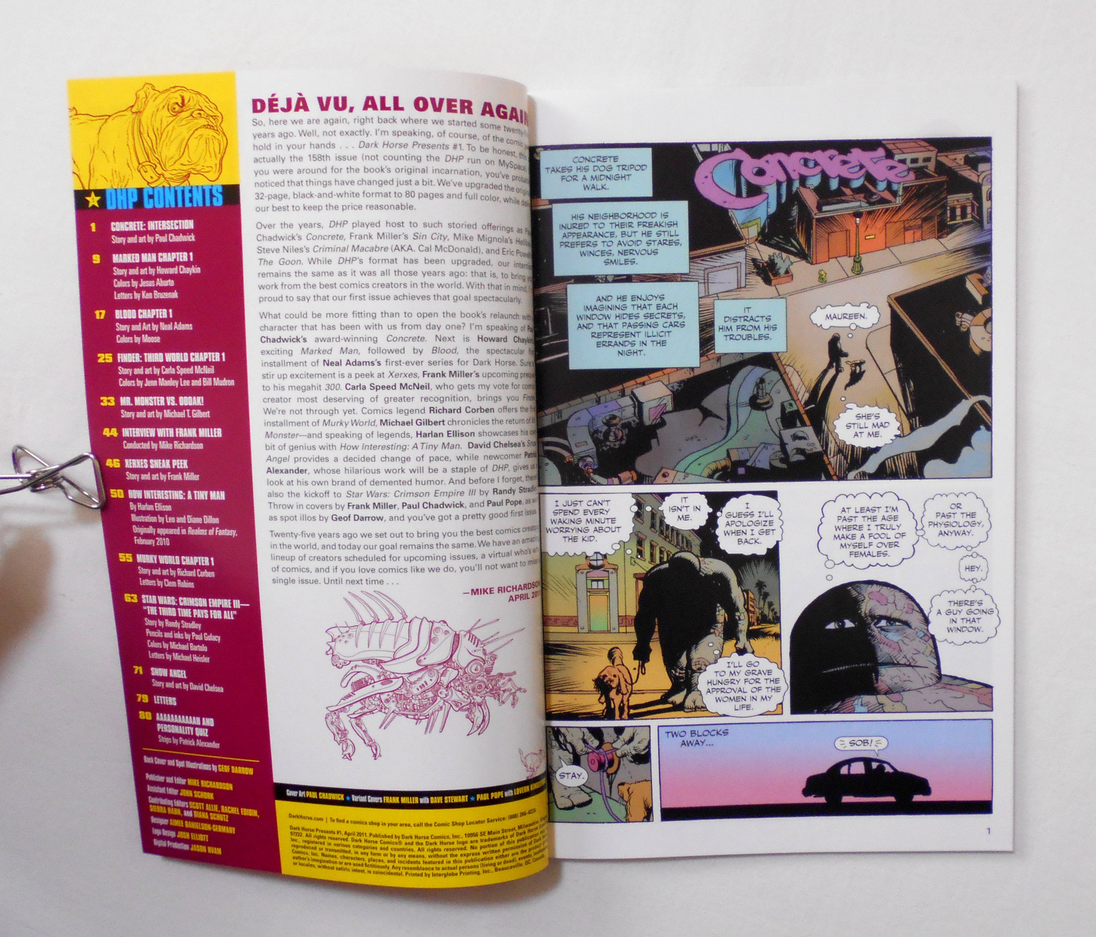 【DARK HORSE PRESENTS】 #1 APRIL 2011◆中古アメリカン・コミック。英文表記の洋書となります。◆フランク・ミラー FRANK MILLERがアートとストーリーを手掛けた "XERXES SNEAK PEEK" +インタビュー、ニール・アダムス NEIL ADAMSがアート&ストーリーを担当した"BLOOD CHAPTER 1"、リチャード・コーベン RICHARD CORBENがアート&ストーリーを担当した"MURKY WORLD CHAPTER 1"、ハーラン・エリソン(HARLAN ELISONによる小説"HOW INTERESTING: A TINY MAN"等、コミック/SciFiのレジェンドによる作品を収録した『DARK HORSE PRESENTS』 リニューアル第1弾 ◆その他作品 CONCRETE by PAUL CHADWICK, MR. MONSTER VS. OOOAK! by MICHAEL T. GILBERT, STAR WARS: CRISMON EMPIRE III etc◆80ページ カラー/白黒 大きさ約26×17センチ◆DARK HORSE COMICS, INC.