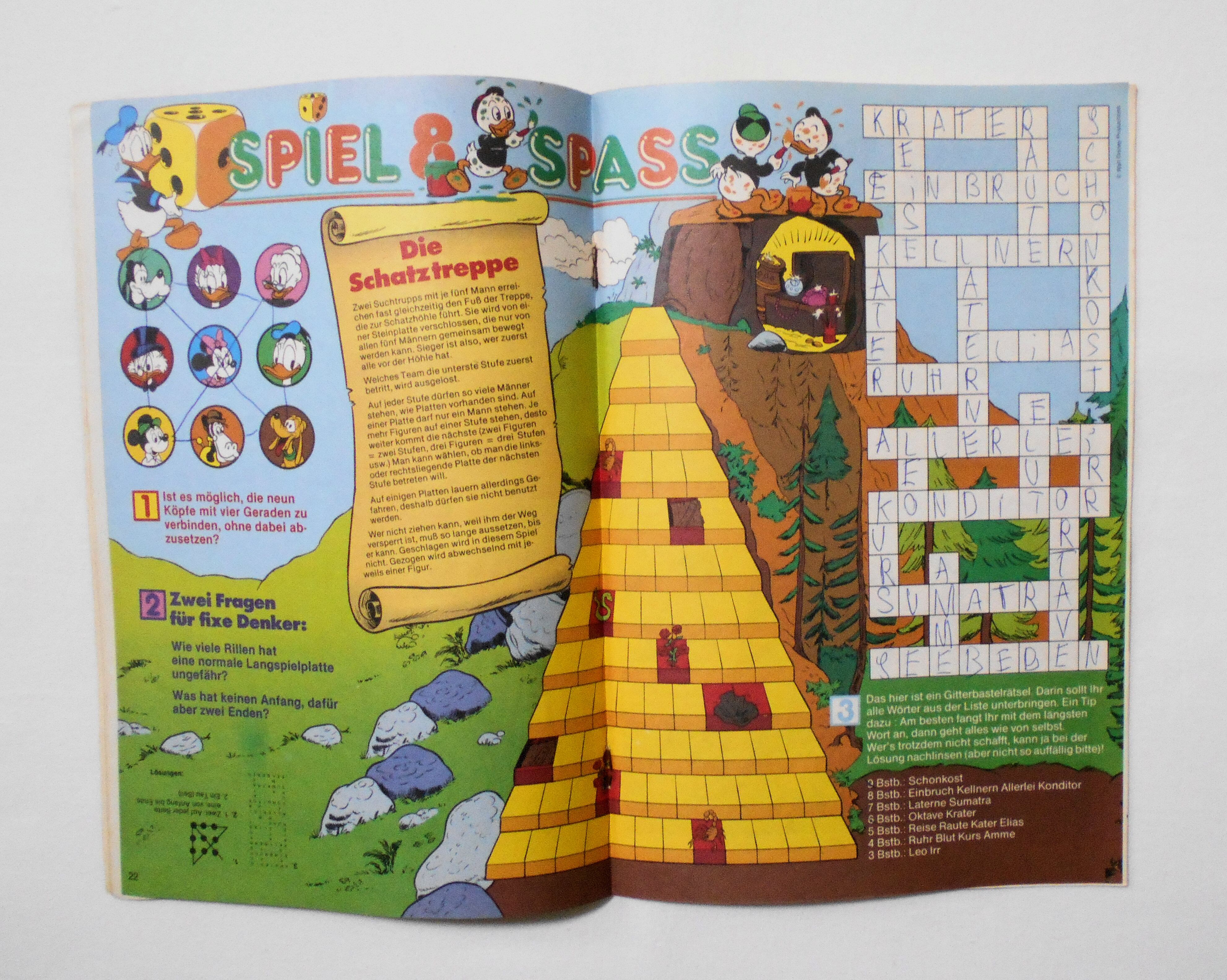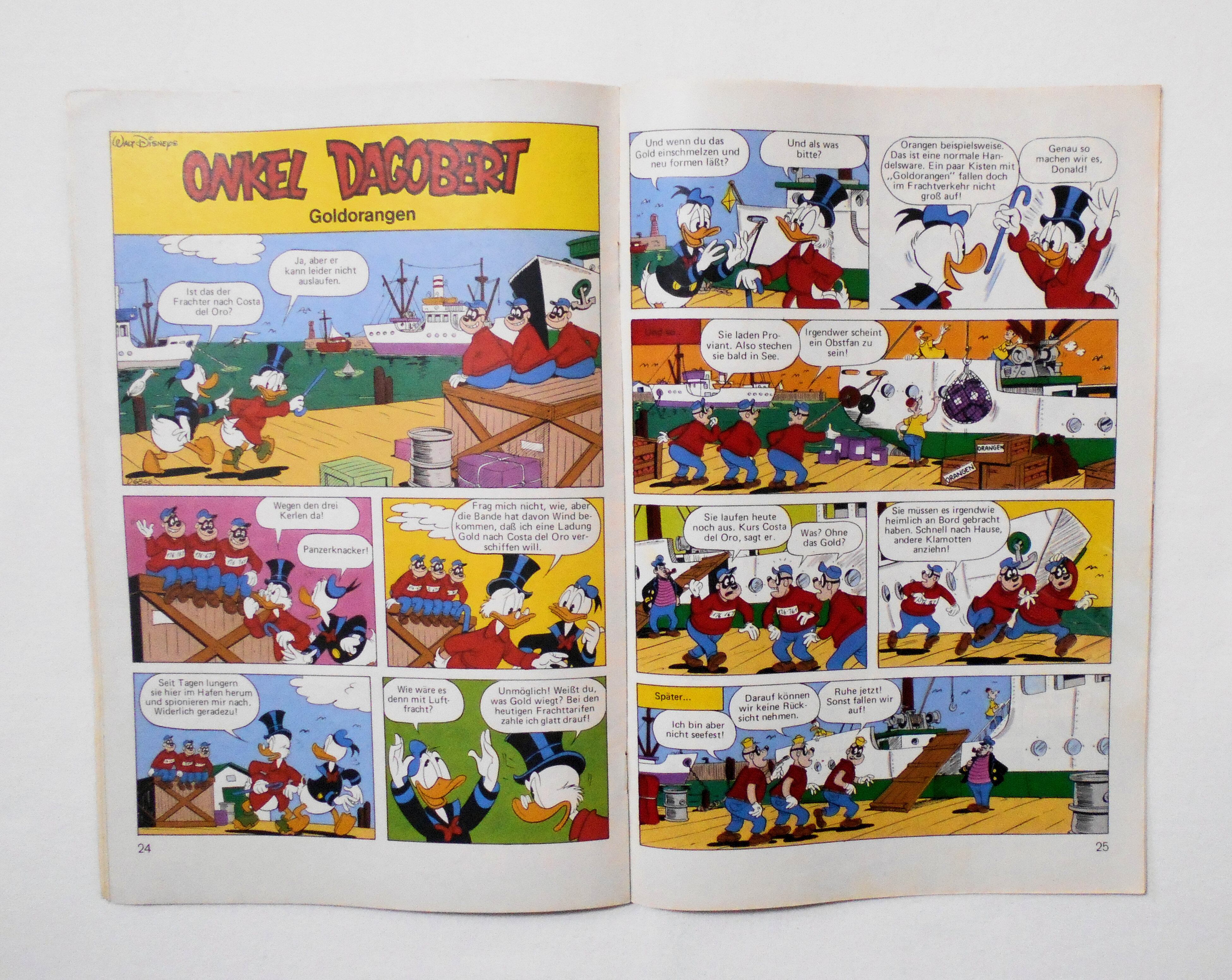 中央見開きページのクロスワードパズル等に遊ばれた書き込み跡があります。表紙のデューイの顔に、おそらく丸いシールを貼って剥がされた跡があります。ヒューイの顔にはペイント擦れ汚れアリ。他、多少の擦れやシワ、黄ばみ、角や端の傷みや折れ、微破れ等があり、経年に伴う使用感は否めませんが、中は目立った汚れやシミ等は無く、1980年代の輸入中古コミックですので、その点を考慮頂ければ、普通程度~おおむねきれいな状態だと思います。新品同様の美品をお求めの方や、中古品にご理解を頂けない方にお薦めは出来ません。