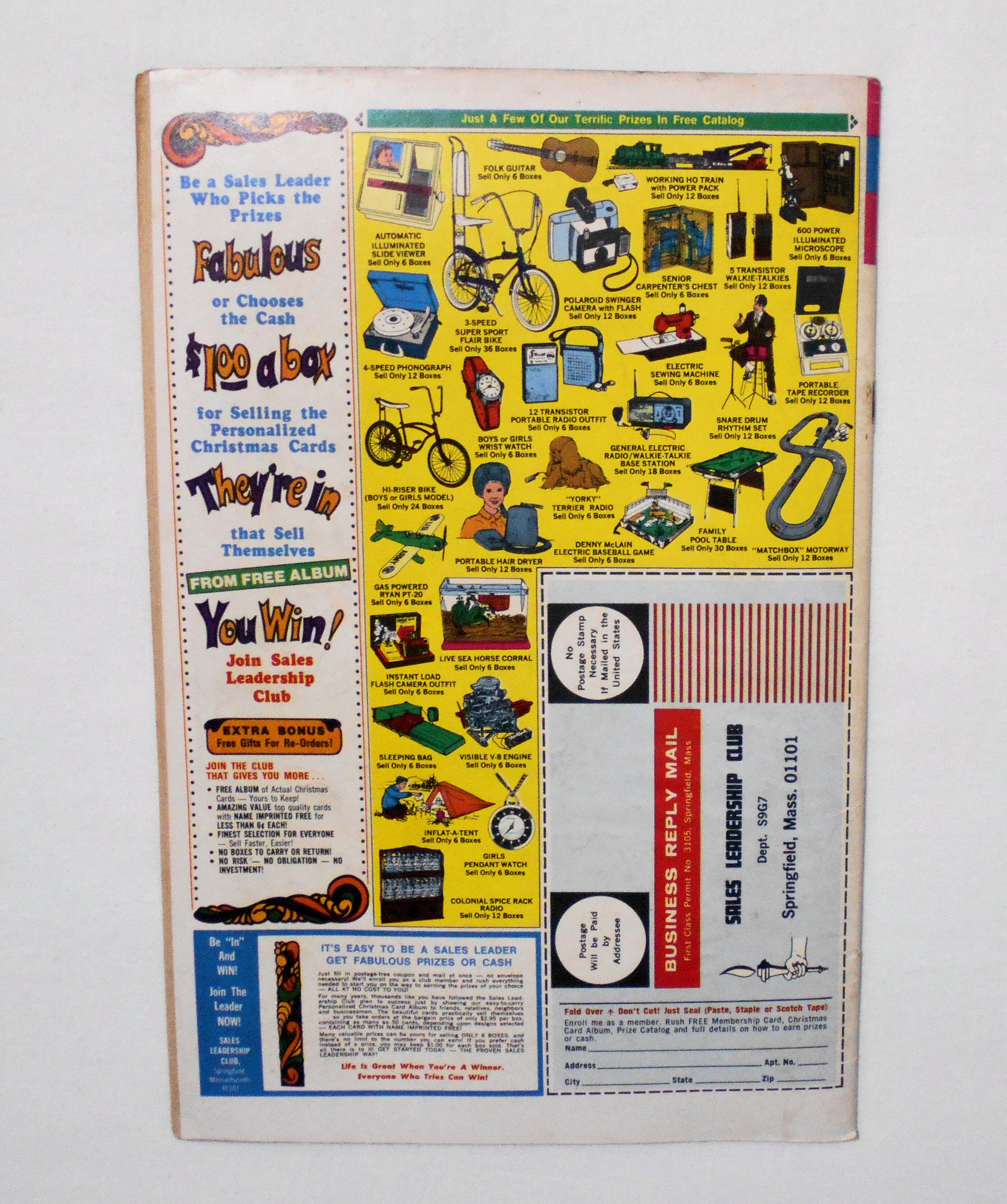 背から内側へ約1センチ縦方向に軽く折れ目が付いています。他、多少の擦れやシワ、黄ばみ、紙ジミ、角や端の傷みや折れ等があり、経年に伴う使用感は否めませんが、1960年代の輸入中古コミックですので、その点を考慮頂ければと思います。中は目立った汚れやシミ等はなく、読むのに支障はございません。新品同様の美品をお求めの方や、中古品にご理解が頂けない方にはお薦め出来ません。