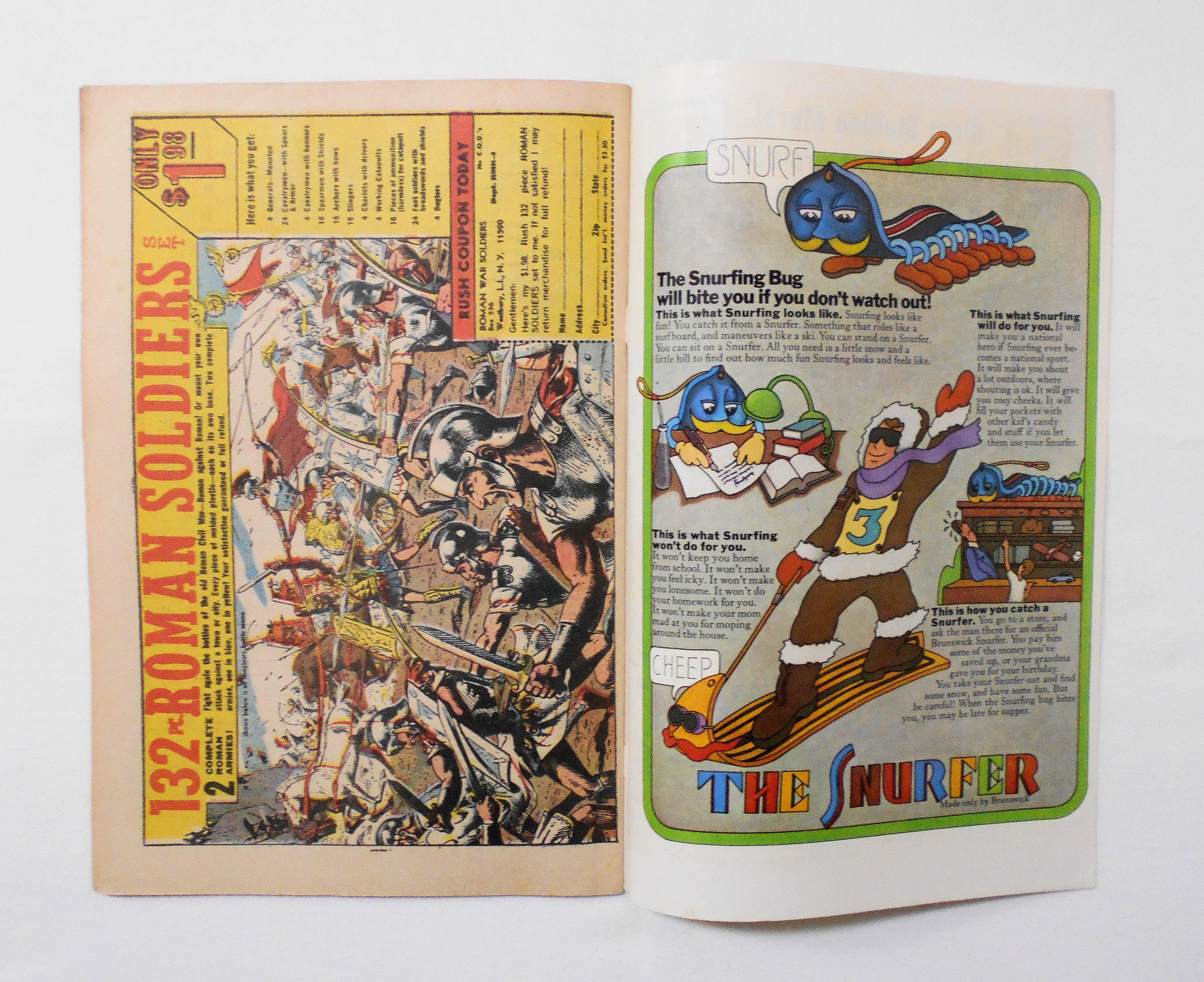 多少の擦れやシワ、黄ばみ、紙ジミ、角や端の傷みや折れ、微破れ等があり、経年に伴う使用感は否めませんが、1970年代の輸入中古コミックですので、その点を考慮頂ければと思います。中は多少黄ばんでいますが、目立った汚れやシミ等はなく、おおむねきれいな状態ですので、読むのに支障はございません。新品同様の美品をお求めの方や、中古品にご理解が頂けない方にはお薦め出来ません。