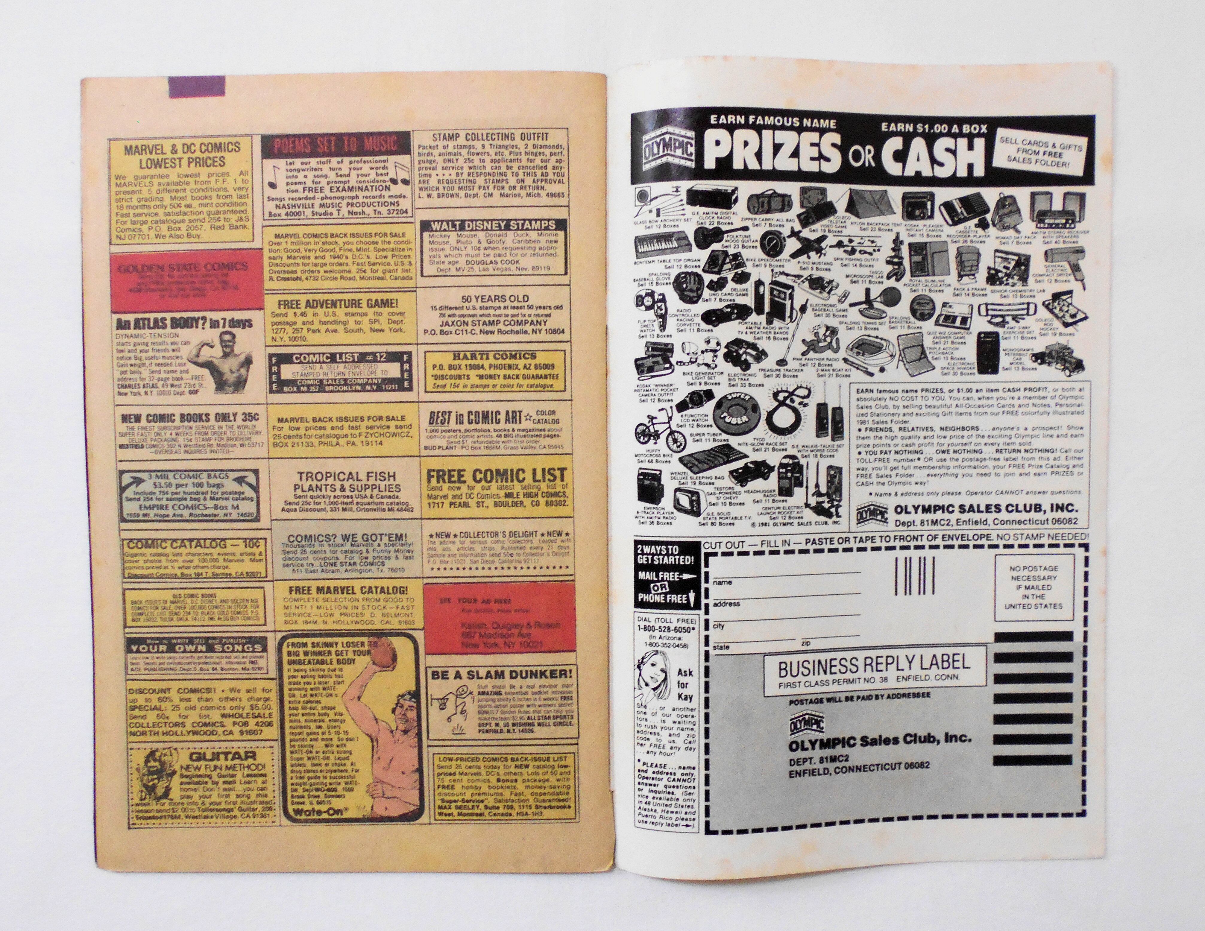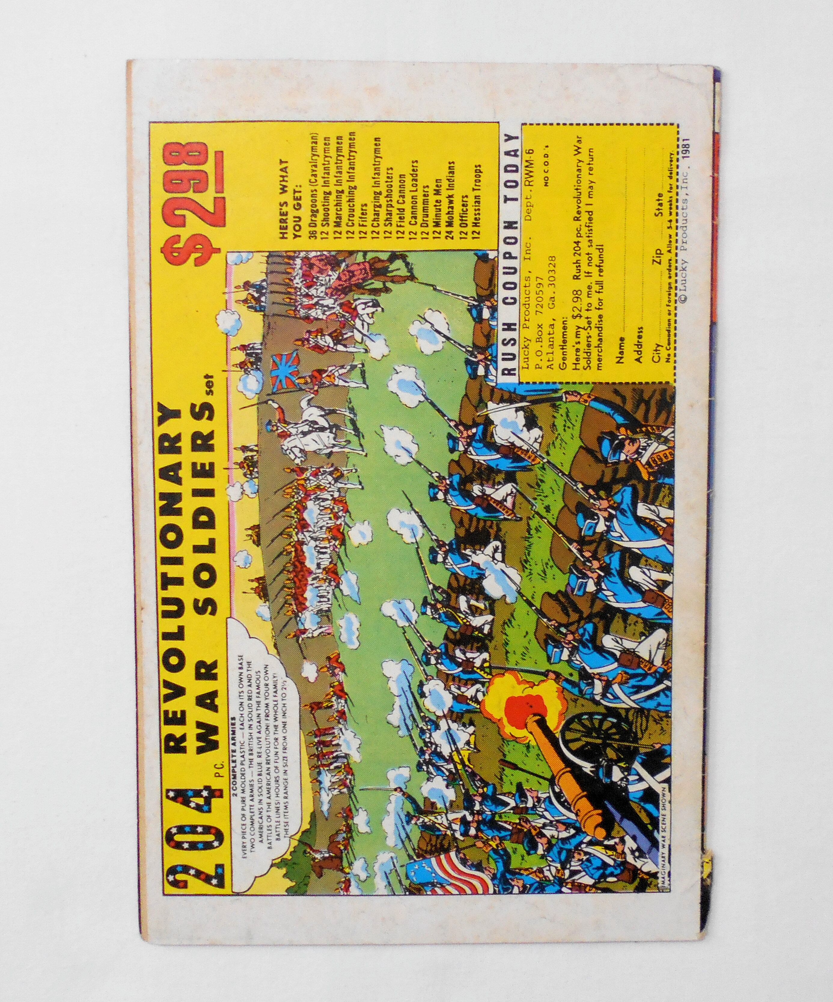 背の下端が破れています。他、多少の擦れやシワ、黒ずみ、黄ばみ、角や端の傷みや折れ、破れ等があり、前述の破れの為、経年に伴う使用感はやや強めと言えますが、目立った汚れやシミ等はなく、1980年代の輸入中古コミックですので、その点を考慮頂ければ、普通程度~おおむねきれいな状態だと思います。新品同様の美品をお求めの方や、中古品にご理解が頂けない方にはお薦め出来ません。
