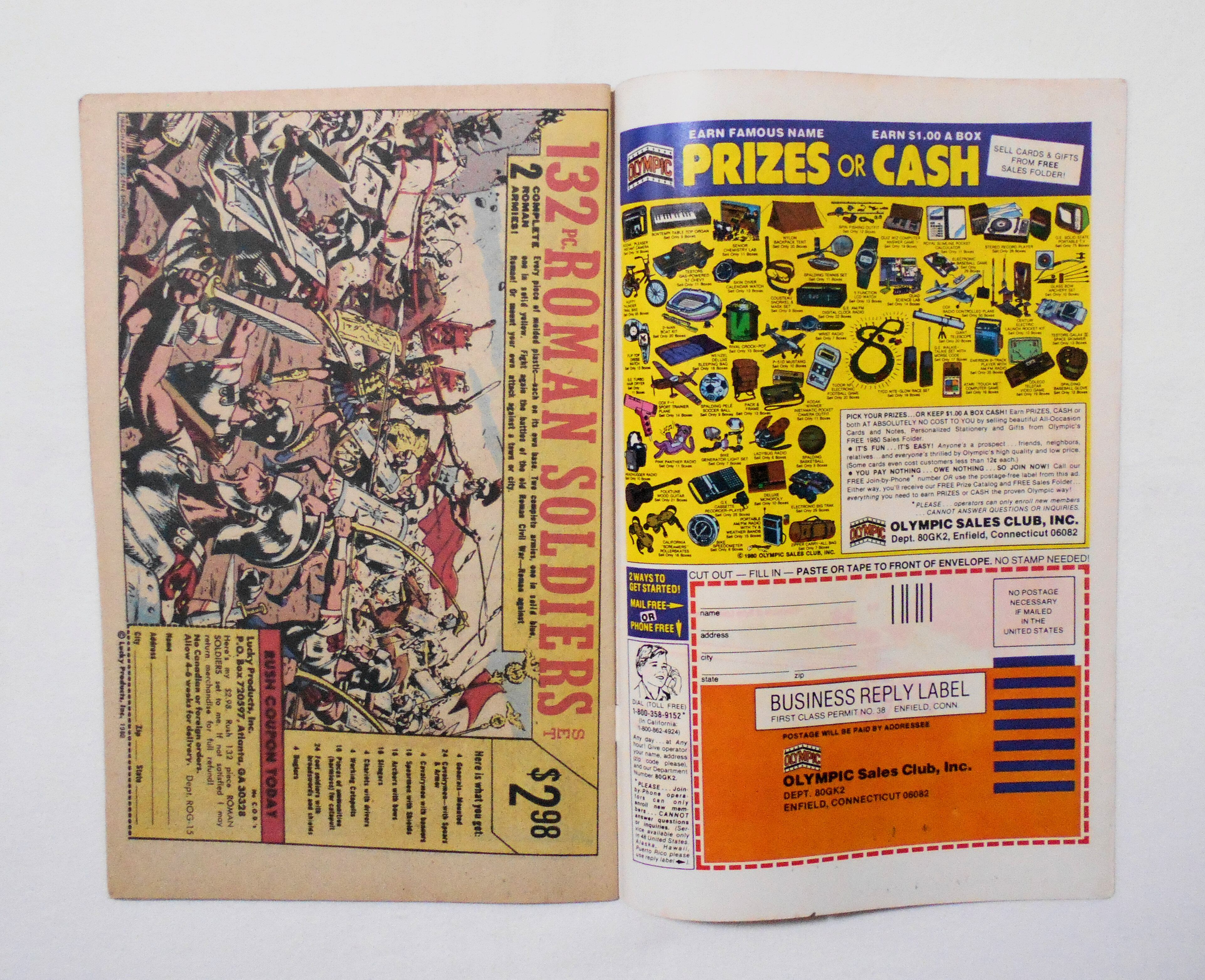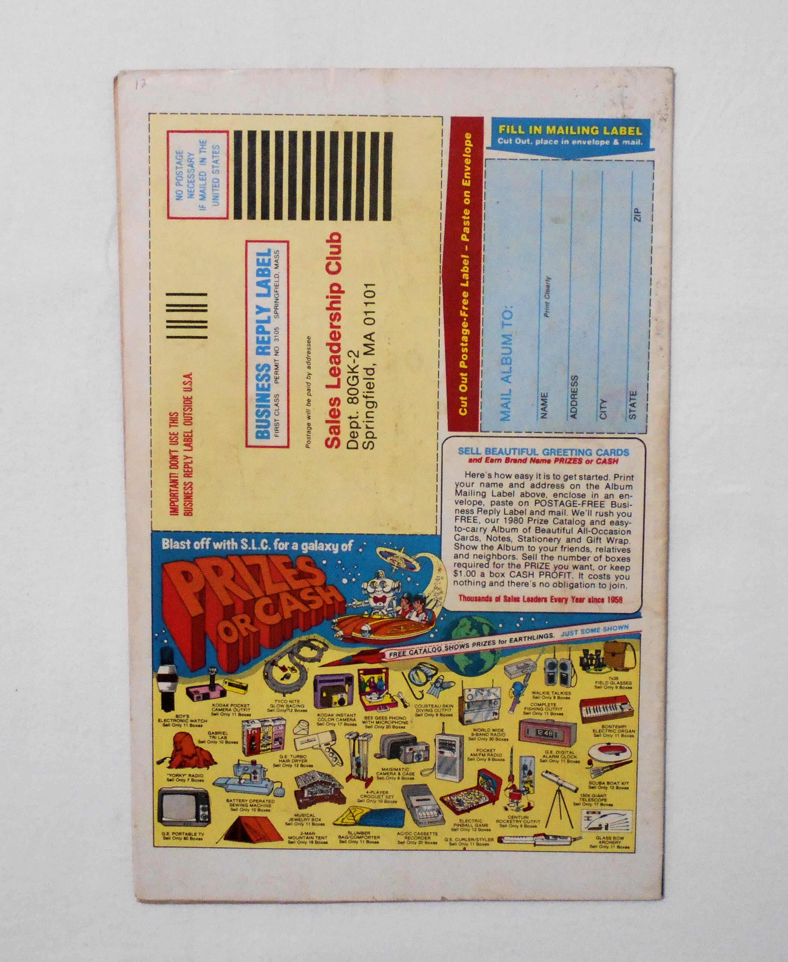 裏表紙の左角上に小さく数字の書き込みがあります。また上ホッチキスの位置が中心よりやや前寄りにズレており、その為僅かに本に歪みが生じています。他、多少の擦れや黒ずみ、シワ、黄ばみ、汚れ(中に1点シミ汚れアリ)、角や端の傷みや折れ、破れ(上下ホッチキス部分に1センチ以下の破れアリ)等があり、経年に伴う使用感は多少強めと言えますが、目立った汚れやシミ等はなく、1980年代の輸入中古コミックですので、その点を考慮頂ければ、普通程度~おおむねきれいな状態だと思います。新品同様の美品をお求めの方や、中古品にご理解が頂けない方にはお薦め出来ません。