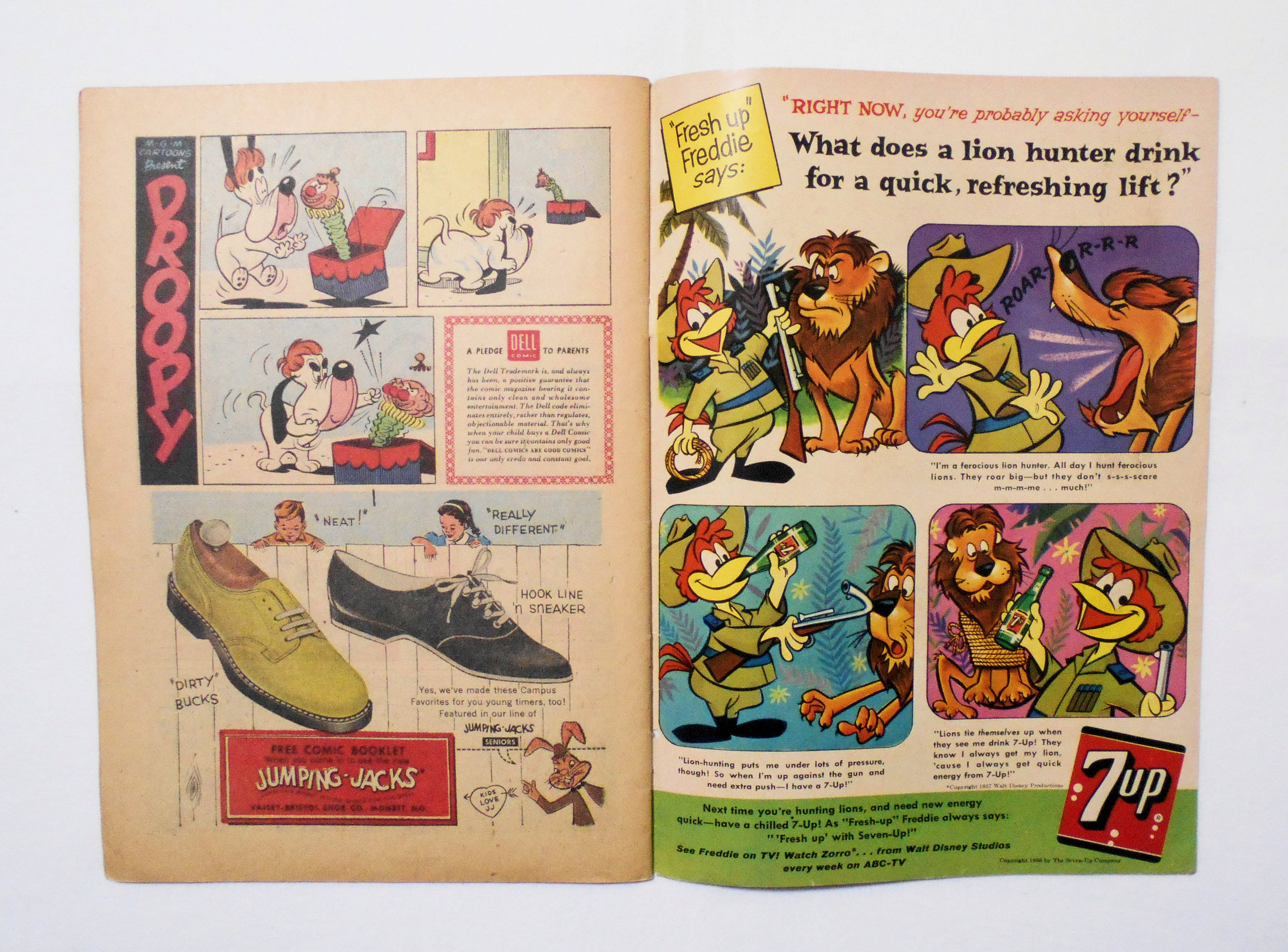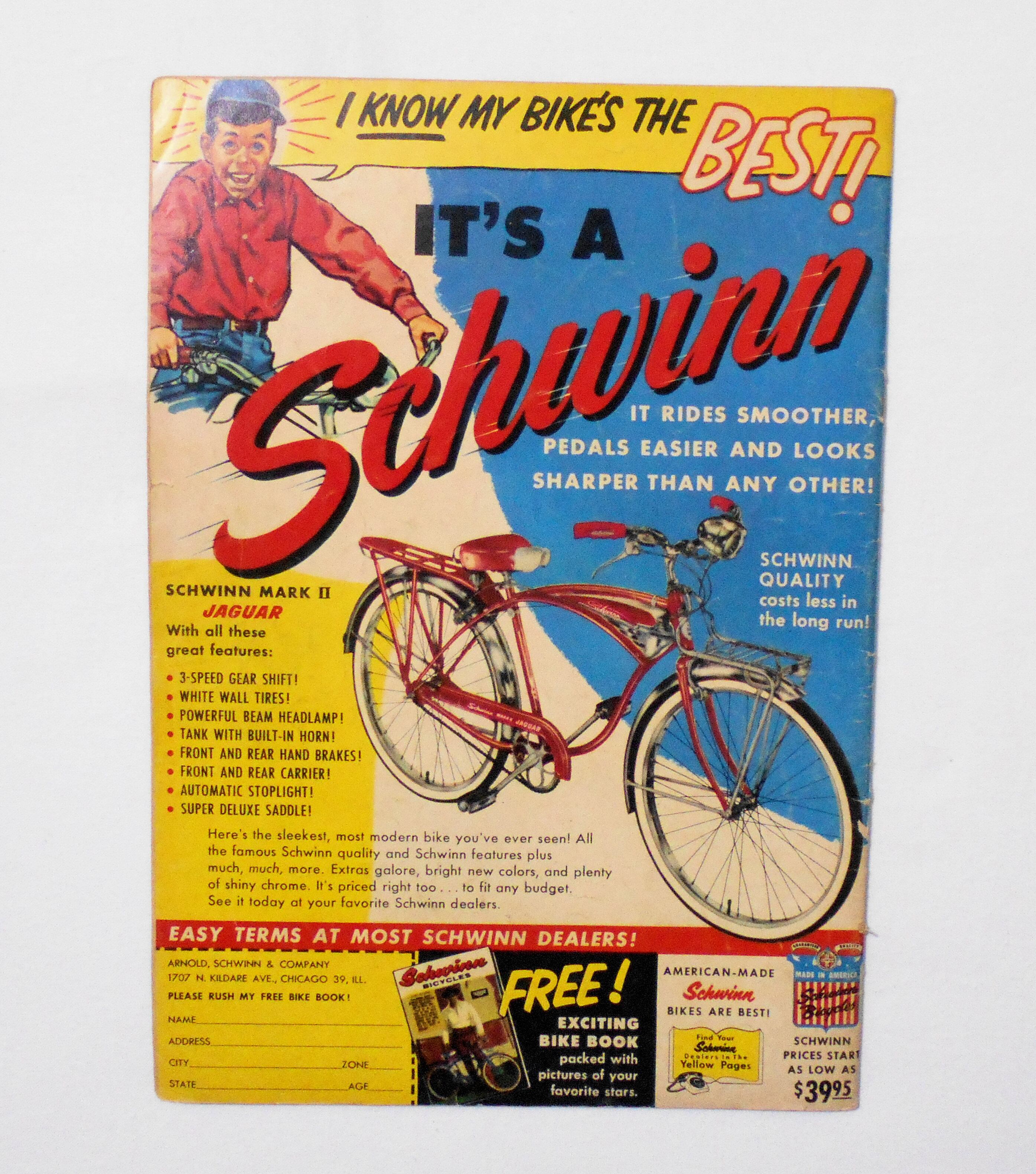 背から内側へ約0.5センチ縦方向に軽く折れ目が付いています。他、多少の擦れやシワ、黄ばみ、紙ジミ、角や端の傷みや折れ、微破れ等があり、経年に伴う使用感はやや強めと言えますが、目立った汚れやシミ等はなく、1950年代の輸入中古コミックですので、その点を考慮頂ければ、普通程度~おおむね良好と言える保存状態だと思います。新品同様の美品をお求めの方や、古書にご理解を頂けない方にお薦めは出来ません。