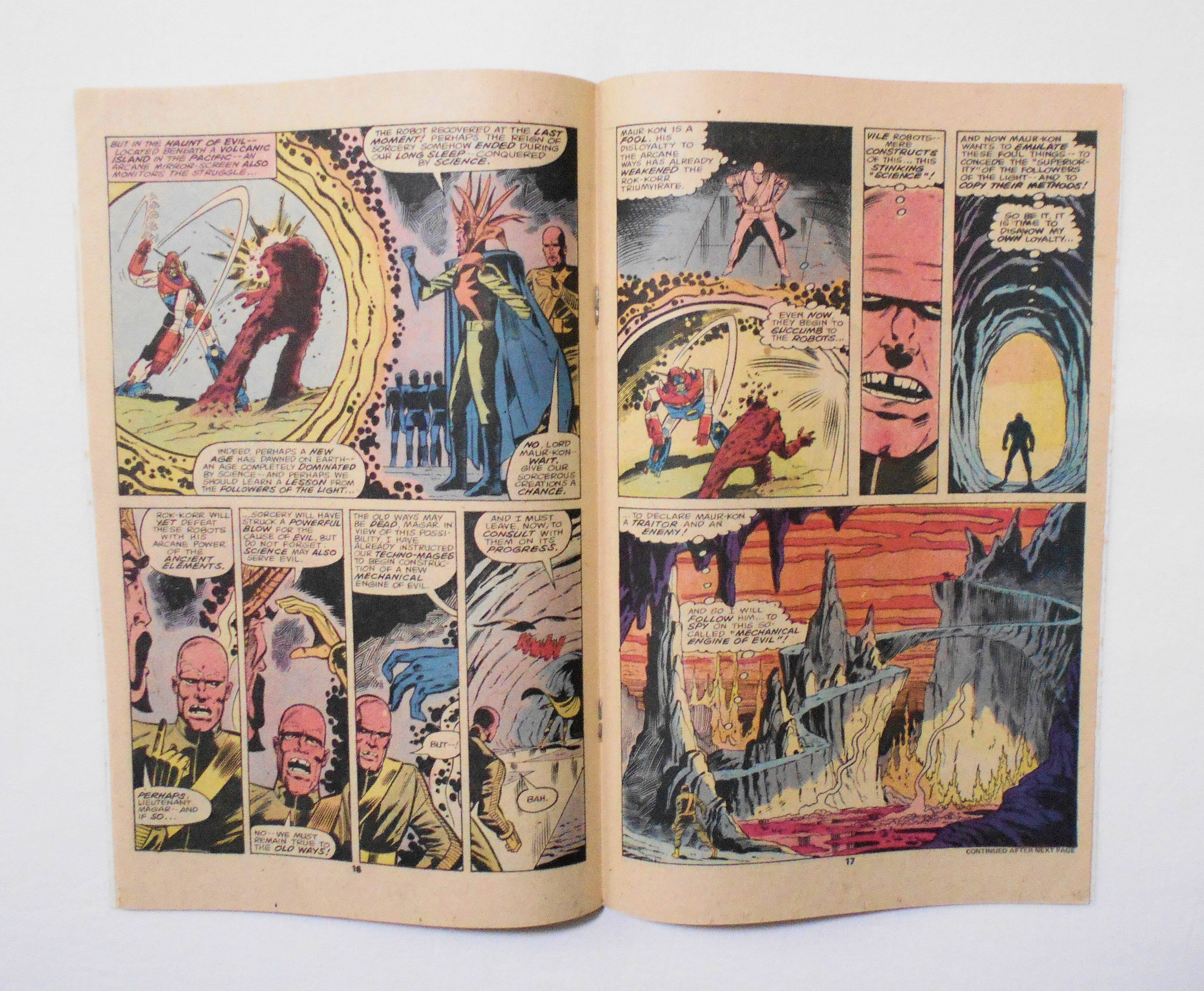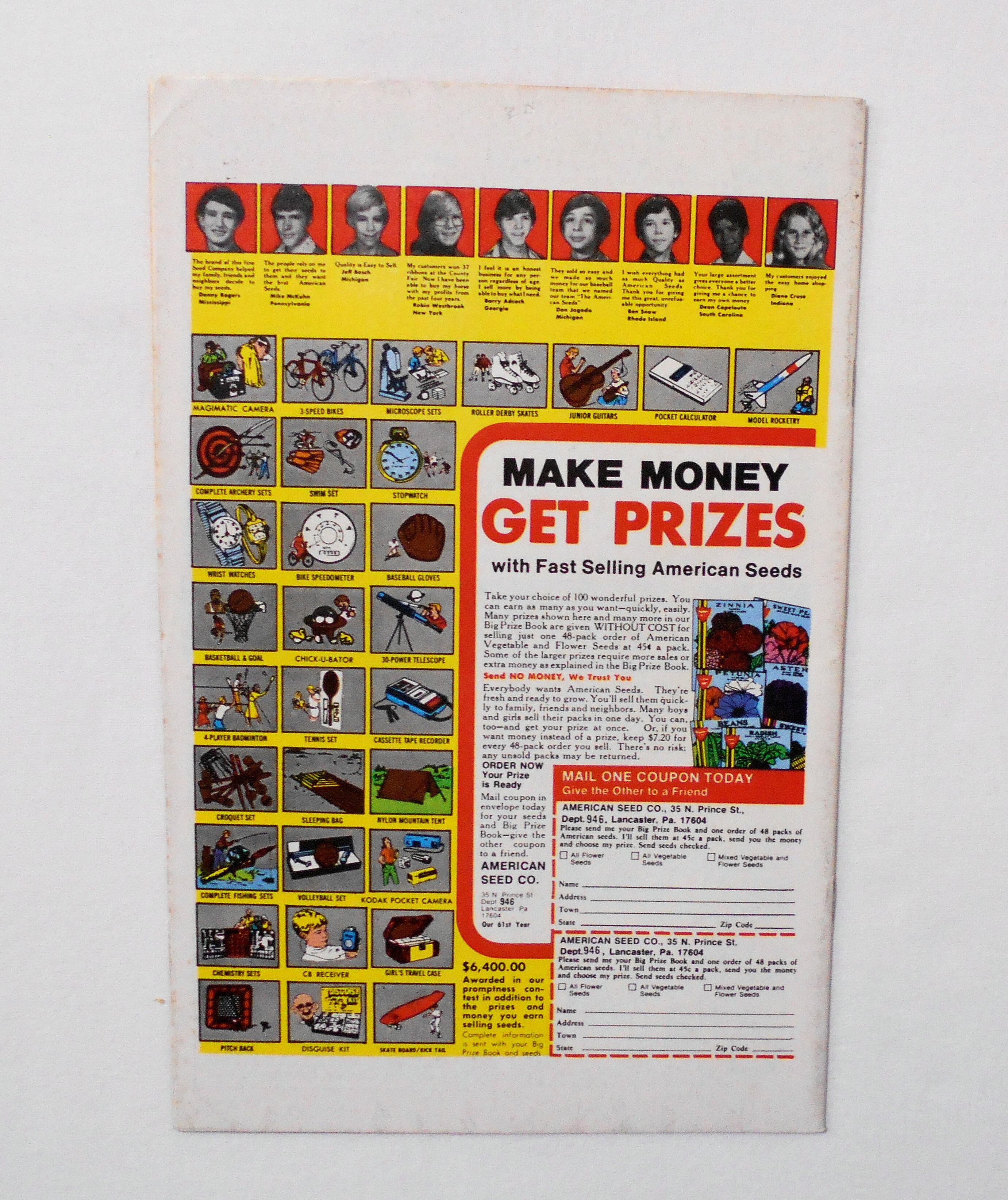 表紙の上端に赤いペイント擦れ汚れアリ。他、多少の擦れやシワ、黄ばみ、角の傷みや折れ等があり、経年に伴う使用感は否めませんが、目立った汚れやシミ等はなく、1970年代の輸入中古コミックですので、その点を考慮頂ければ、普通程度~おおむねきれいな状態だと思います。新品同様の美品をお求めの方や、中古品にご理解を頂けない方にお薦めは出来ません。