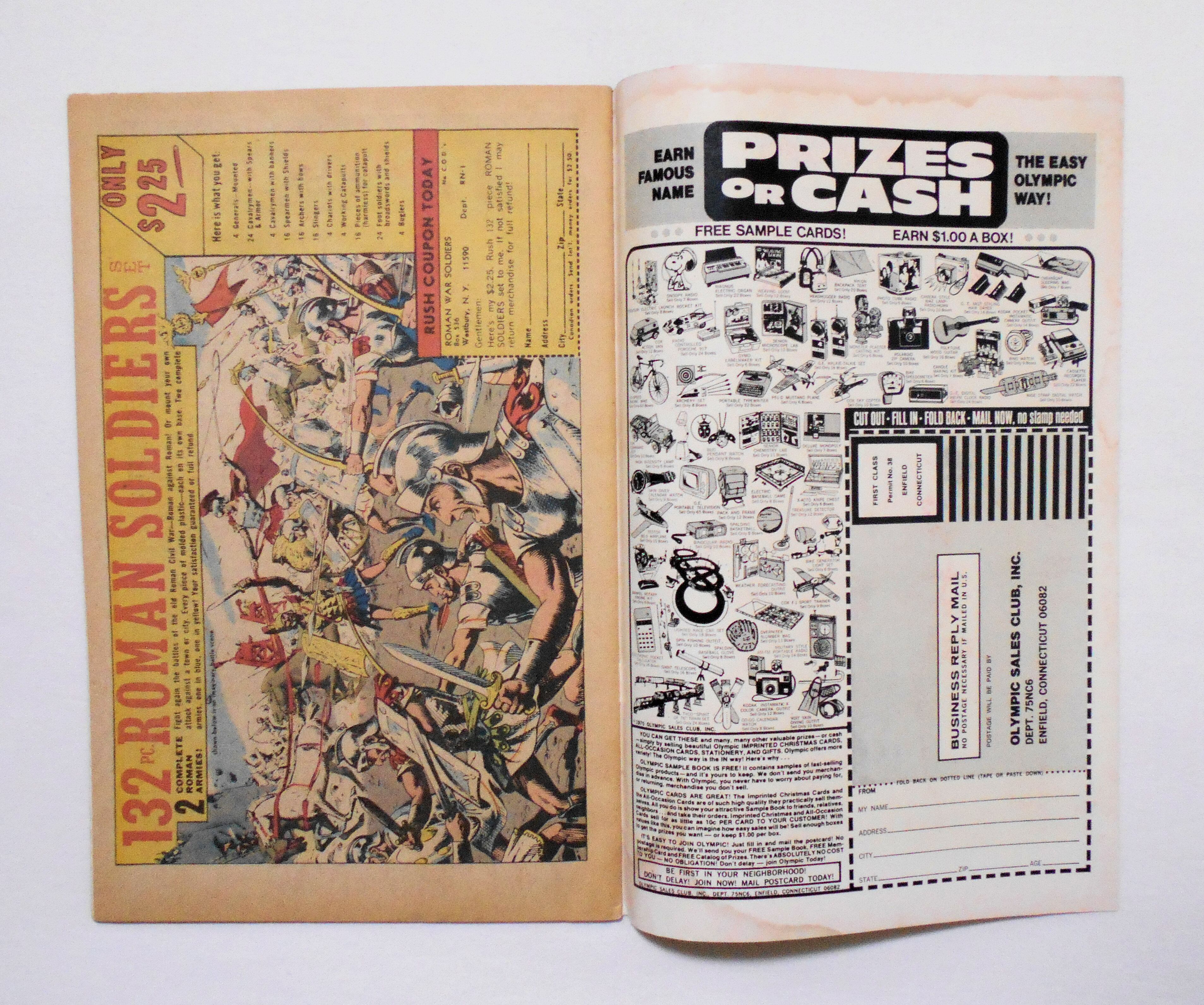 本の上端に濡れジミ跡があります。表紙にはくっきりとシミ跡がございますが、中はやや波打つようなシワになり、他よりも黄ばみが強めですが、目立つシミ汚れは無く、黄ばみが強いところもほぼ上端余白部分ですので、読むのに支障はございません。また裏表紙の小口側にも濡れジミ跡がございますが、こちらは中のページには殆ど影響はななそうです。また表紙、背から内側へ約1センチ縦方向に軽く折れ目が付いています。他、多少の擦れやシワ、黄ばみ、紙ジミ、角や端の傷みや折れ等があり、経年に伴う使用感は多少強めと言えますが、1970年代の輸入中古コミックですので、その点を考慮頂ければと思います。香奈は多少黄ばんでいますが、目立った汚れやシミ等はなく、おおむねきれいな状態ですので、前述のとおり読むのに支障はございません。新品同様の美品をお求めの方や、中古品にご理解が頂けない方にはお薦め出来ません。