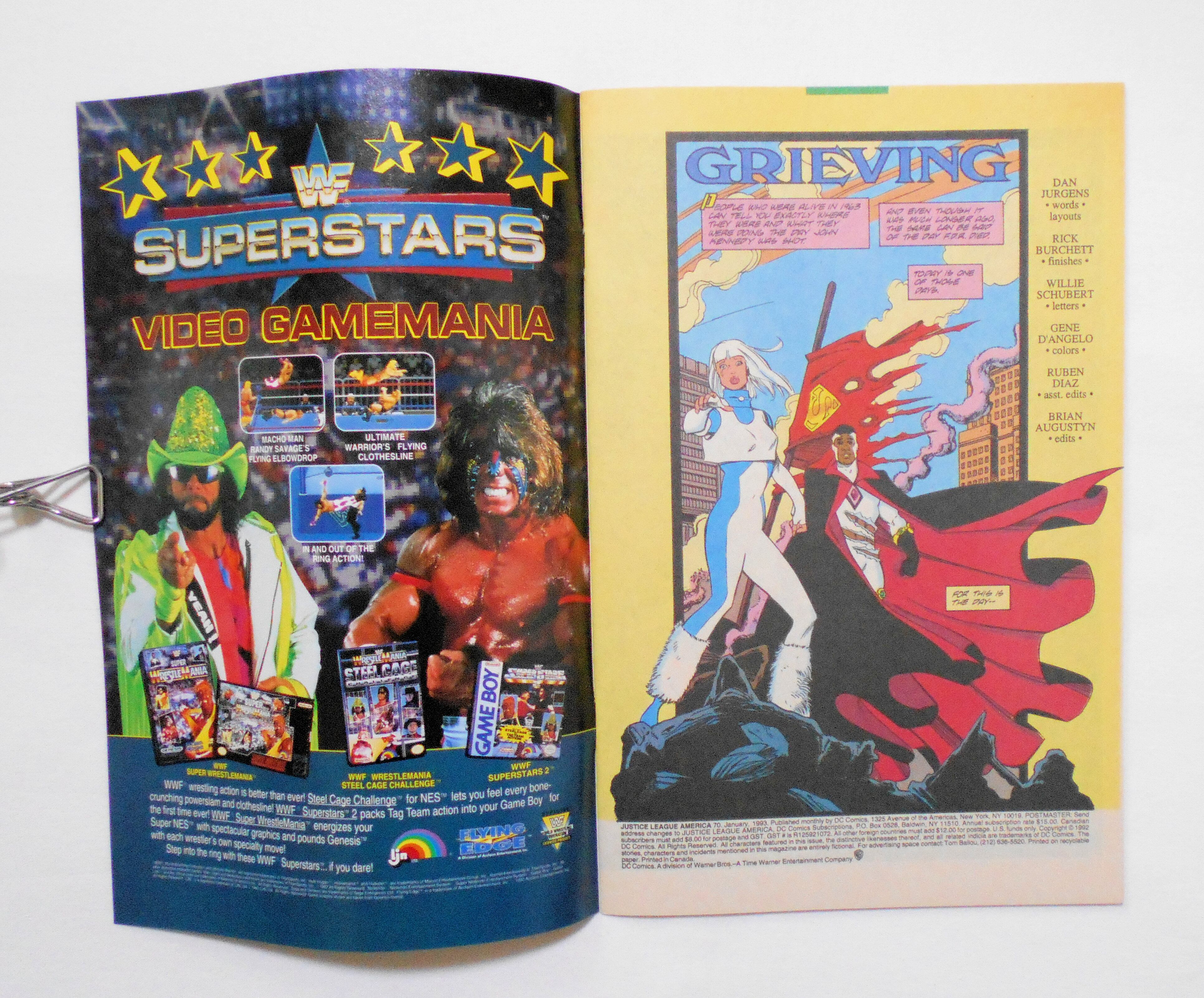 【JUSTICE LEAGUE AMERICA】 #70 JAN. 1993◆SUPERMAN IS DEAD. THE MOURNING AFTER BEGINS HERE!◆中古アメリカン・コミック。英文表記の洋書となります。◆32ページ フルカラー 大きさ約26×17センチ◆DC COMICS◆クロスオーバー作品『THE DEATH OF SUPERMAN 邦題: スーパーマンの最期』直後のエピソードの第1話。カバーは2重になっています。