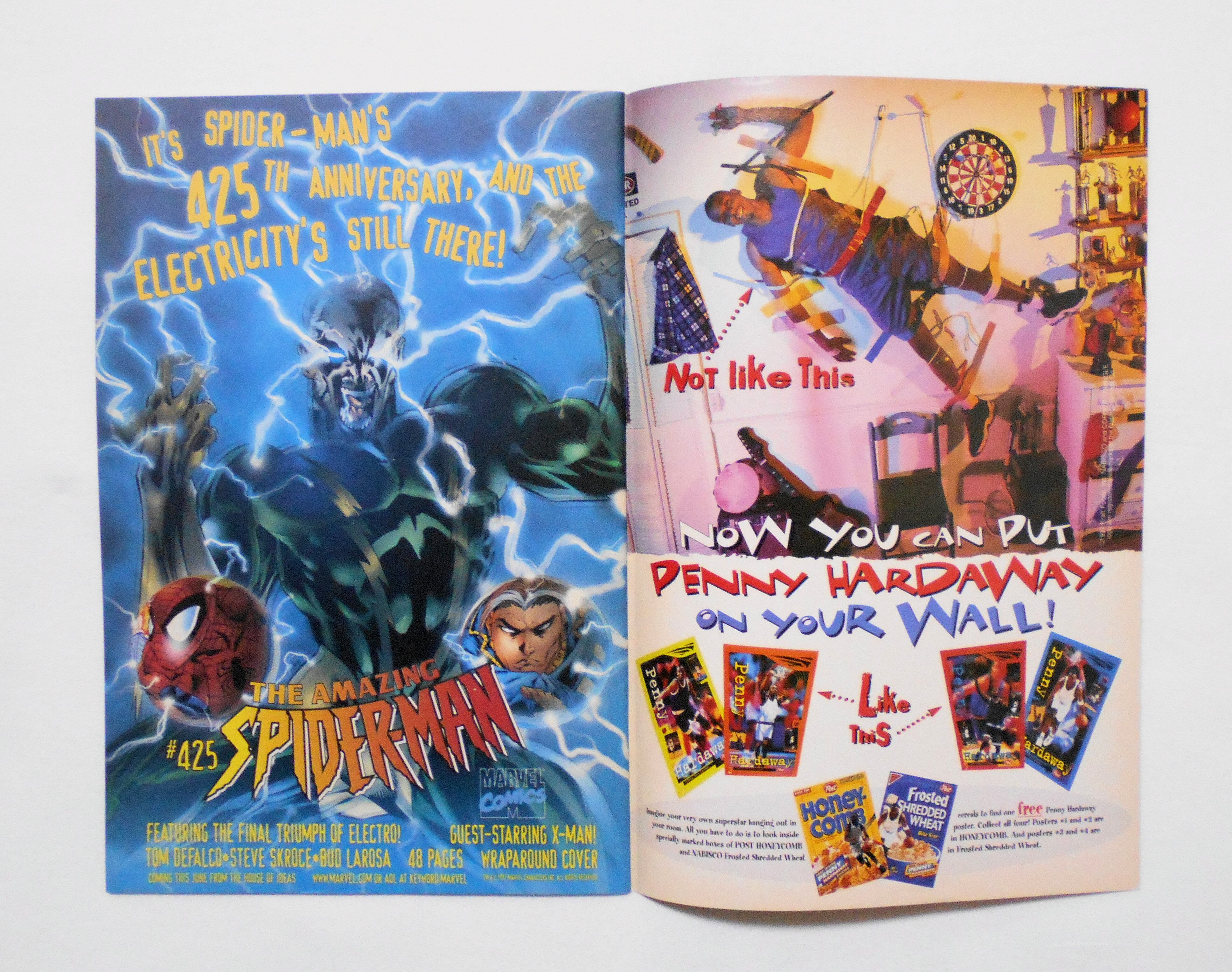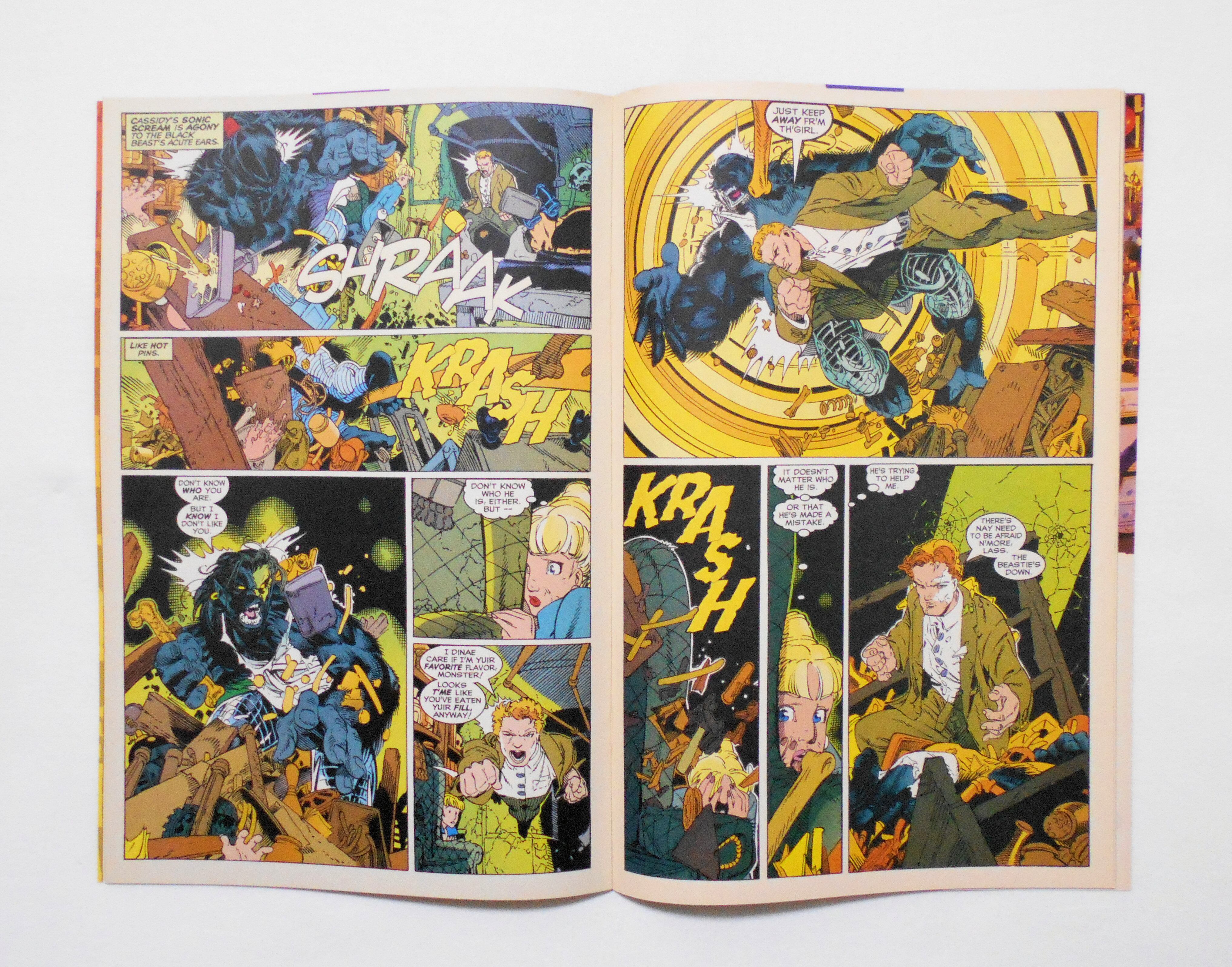 背から内側へ約1センチ縦方向に軽く折れ目が付いています。他、多少の擦れやシワ、黄ばみ、角や端の傷み等があり、経年に伴う使用感は否めませんが、目立った汚れやシミ等はなく、1990年代の輸入中古コミックですので、その点を考慮して頂ければ、普通程度~おおむねきれいな状態だと思います。新品同様の美品をお求めの方や、中古品にご理解が頂けない方にはお薦め出来ません。