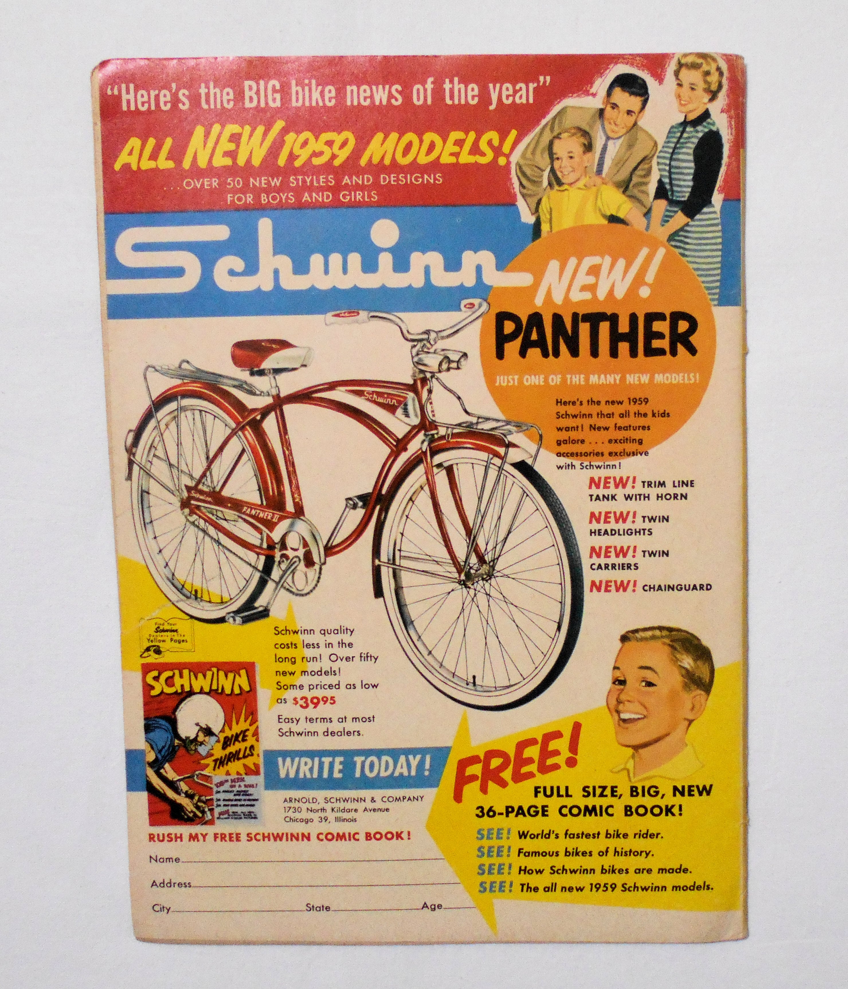 背から内側へ約0.5センチ縦方向に軽く折れ目が付いています。他、多少の擦れやシワ、黄ばみ、紙ジミ、角や端の傷みや折れ、破れ(表紙の下端に2センチほどの破れと、裏表紙の小口側に4センチほどの破れがございます)等があり、経年に伴う使用感は否めませんが、目立った汚れやシミ等はなく、1950年代の輸入中古コミックですので、その点を考慮頂ければ、普通程度~おおむね良好と言える保存状態だと思います。新品同様の美品をお求めの方や、古書にご理解を頂けない方にお薦めは出来ません。