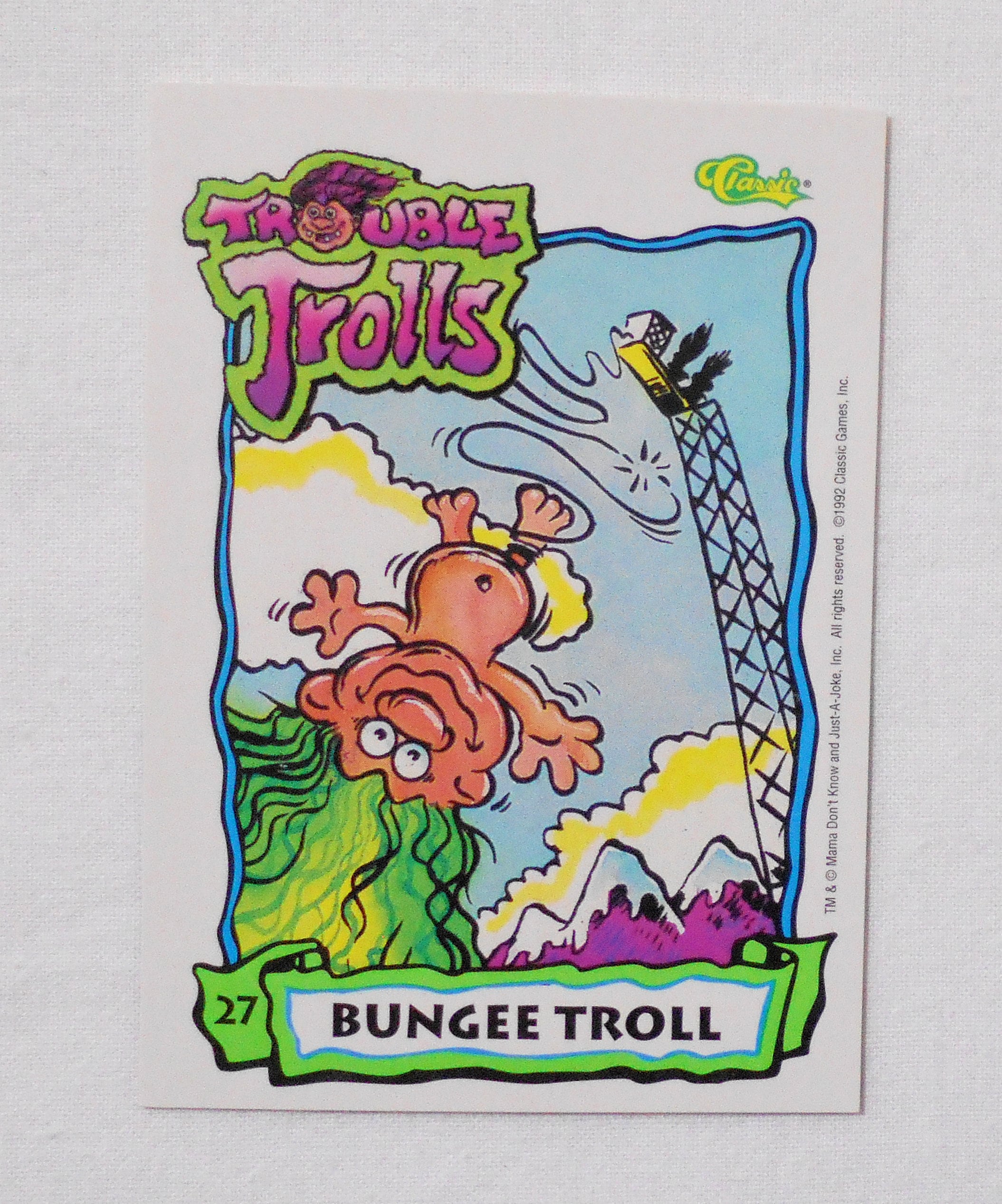 【NO.27 BUNGEE TROLL [トラブル・トロール TROUBLE TROLLS TRADING CARDS]】◆カードの大きさ約9×6.5センチ◆MAMA DON'T KNOW AND JUST-A-JOKE, INC. ALL RIGHT RESERVED◆COPYRIGHT 1992 CLASSIC GAMES, INC.◆1枚目の写真が表、2枚目の写真が裏側で全部集めて並べると1枚の大きなイラストになるようです。