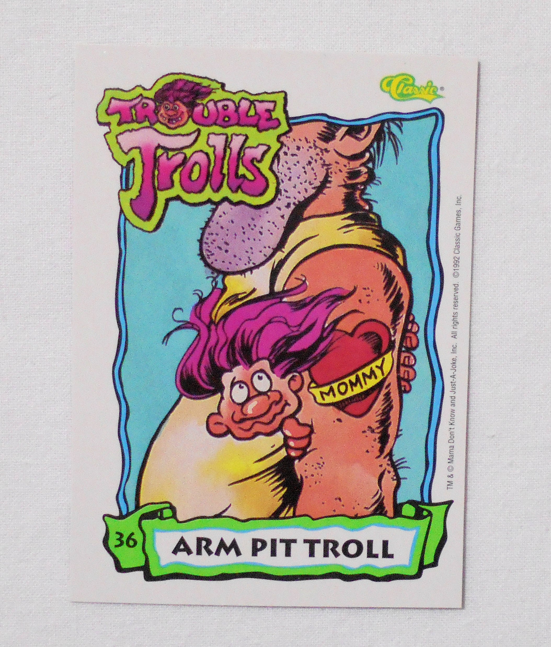 【NO.36 ARM PIT TROLL [トラブル・トロール TROUBLE TROLLS TRADING CARDS]】◆カードの大きさ約9×6.5センチ◆MAMA DON'T KNOW AND JUST-A-JOKE, INC. ALL RIGHT RESERVED◆COPYRIGHT 1992 CLASSIC GAMES, INC.◆1枚目の写真が表、2枚目の写真が裏側で全部集めて並べると1枚の大きなイラストになるようです。