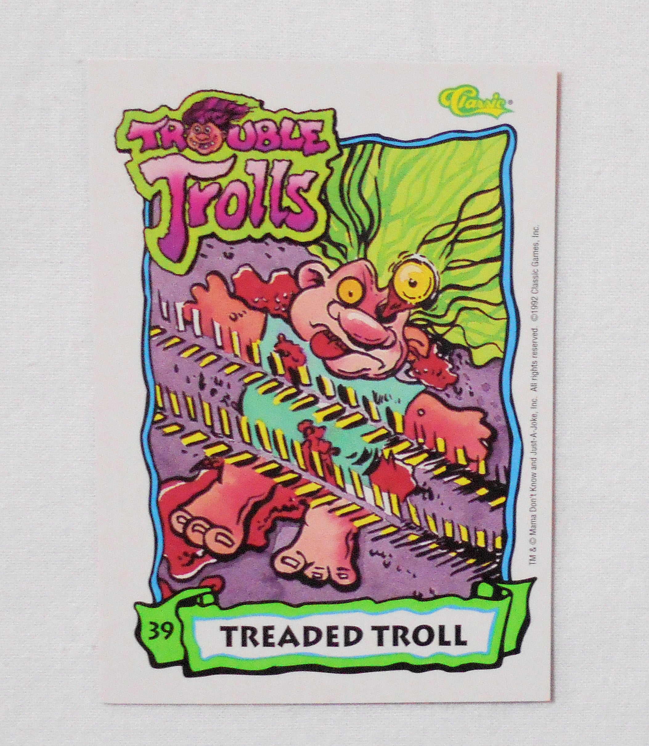 【NO.39 TREADED TROLL [トラブル・トロール TROUBLE TROLLS TRADING CARDS]】◆カードの大きさ約9×6.5センチ◆MAMA DON'T KNOW AND JUST-A-JOKE, INC. ALL RIGHT RESERVED◆COPYRIGHT 1992 CLASSIC GAMES, INC.◆1枚目の写真が表、2枚目の写真が裏側で全部集めて並べると1枚の大きなイラストになるようです。