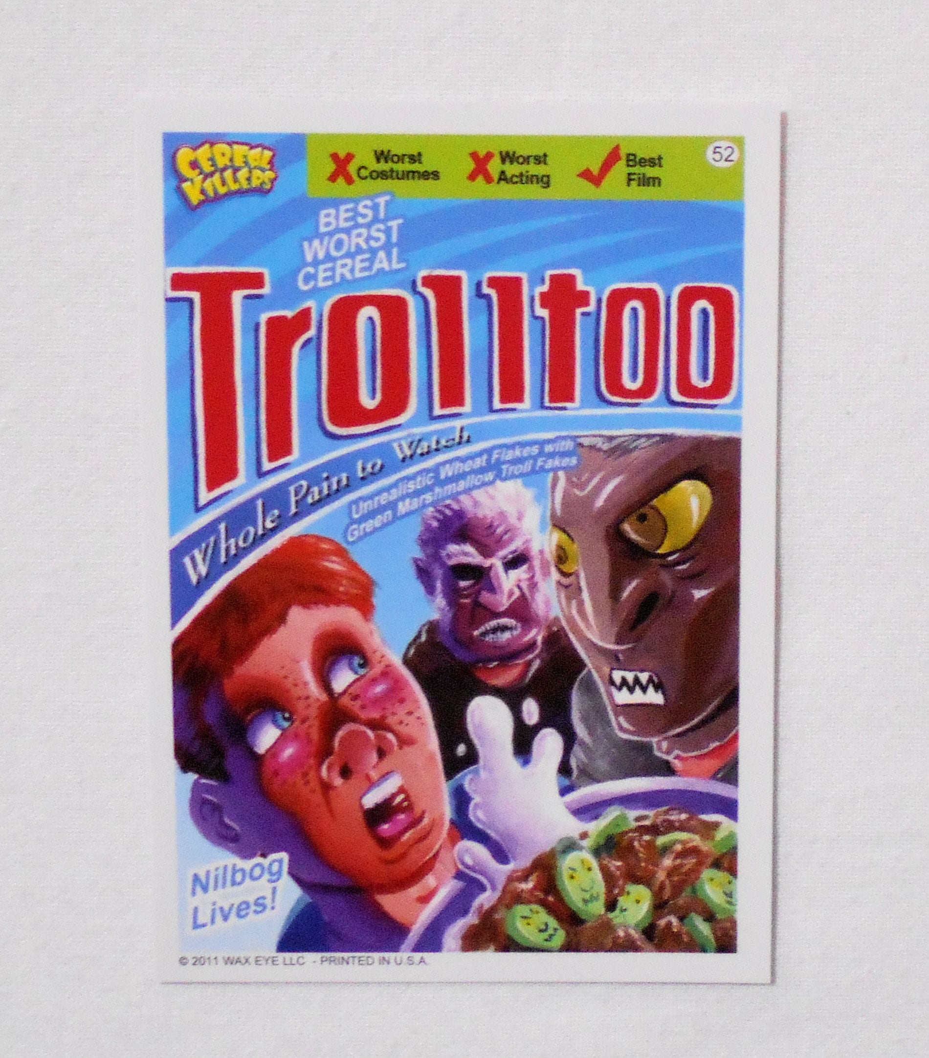 【NO.52 TROLL TOO [CEREAL KILLERS TRADING CARDS 1st SERIES]】◆元ネタとなった映画もシリアルも分かりませんでした。◆大きさ約9×6.5センチ◆COPYRIGHT 2011 WAX EYE LLC ALL RIGHT RESERVED◆PRINTED IN USA