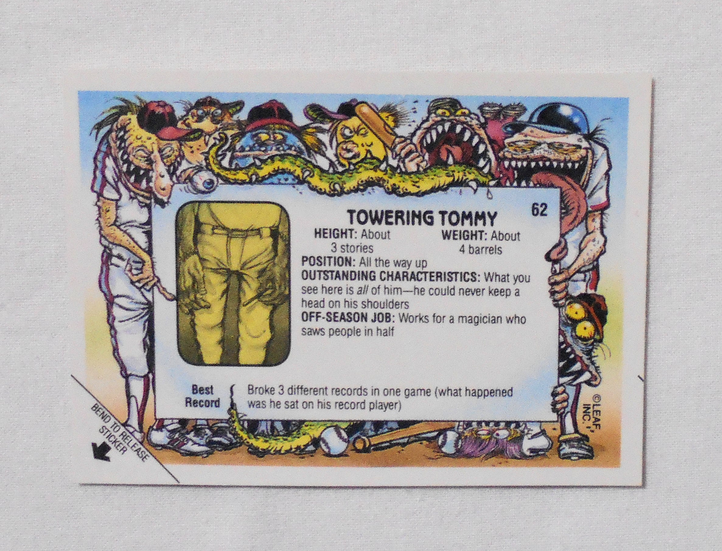 【NO.62-A TOWERING TOMMY [BASEBALLS GREATEST GROSS OUTS STICKERS & BUBBLE GUM]】 LEAF <1988年> トレーディングカード トレカ | LINUS' BLANKET COMIC SHOP