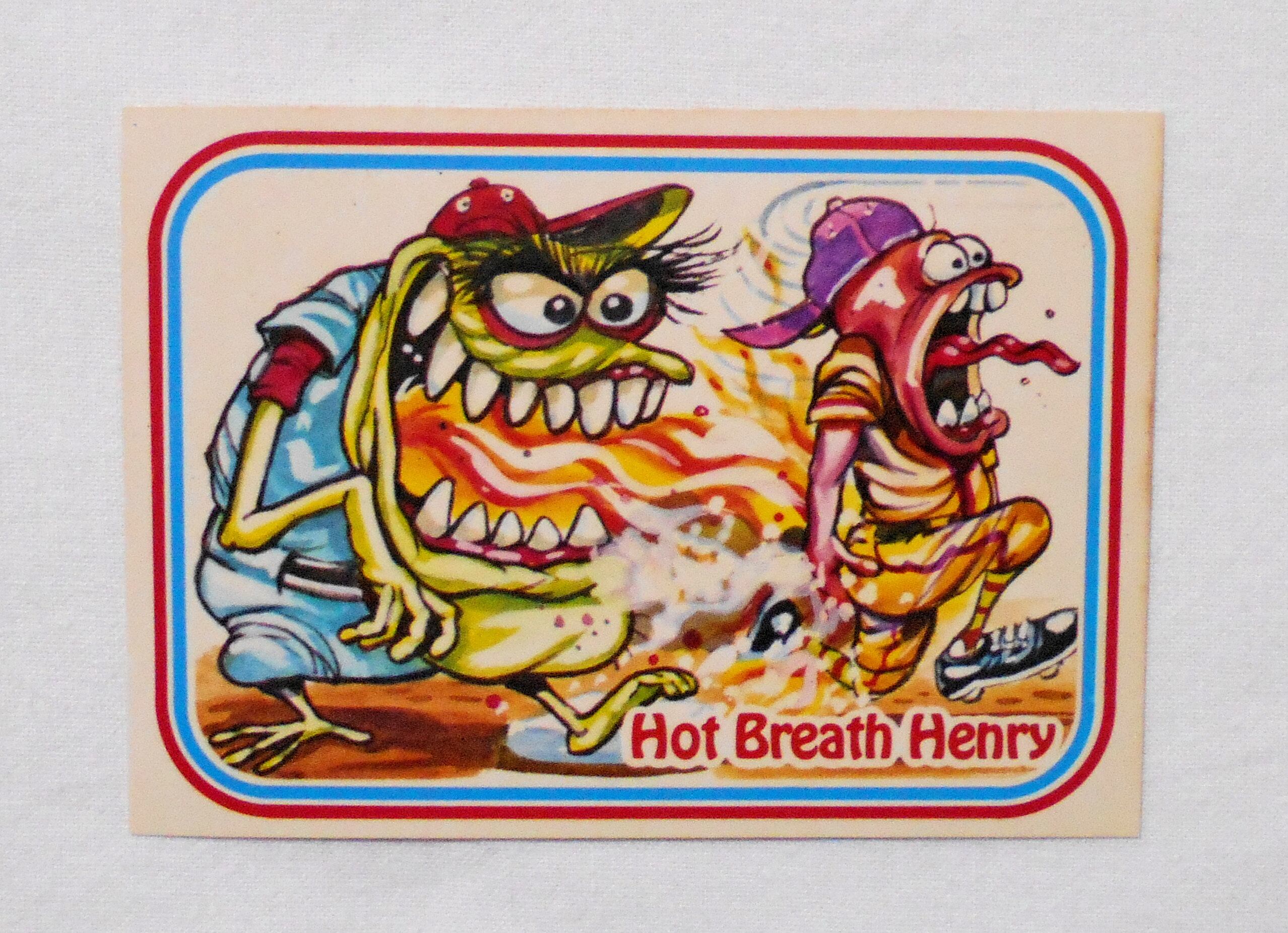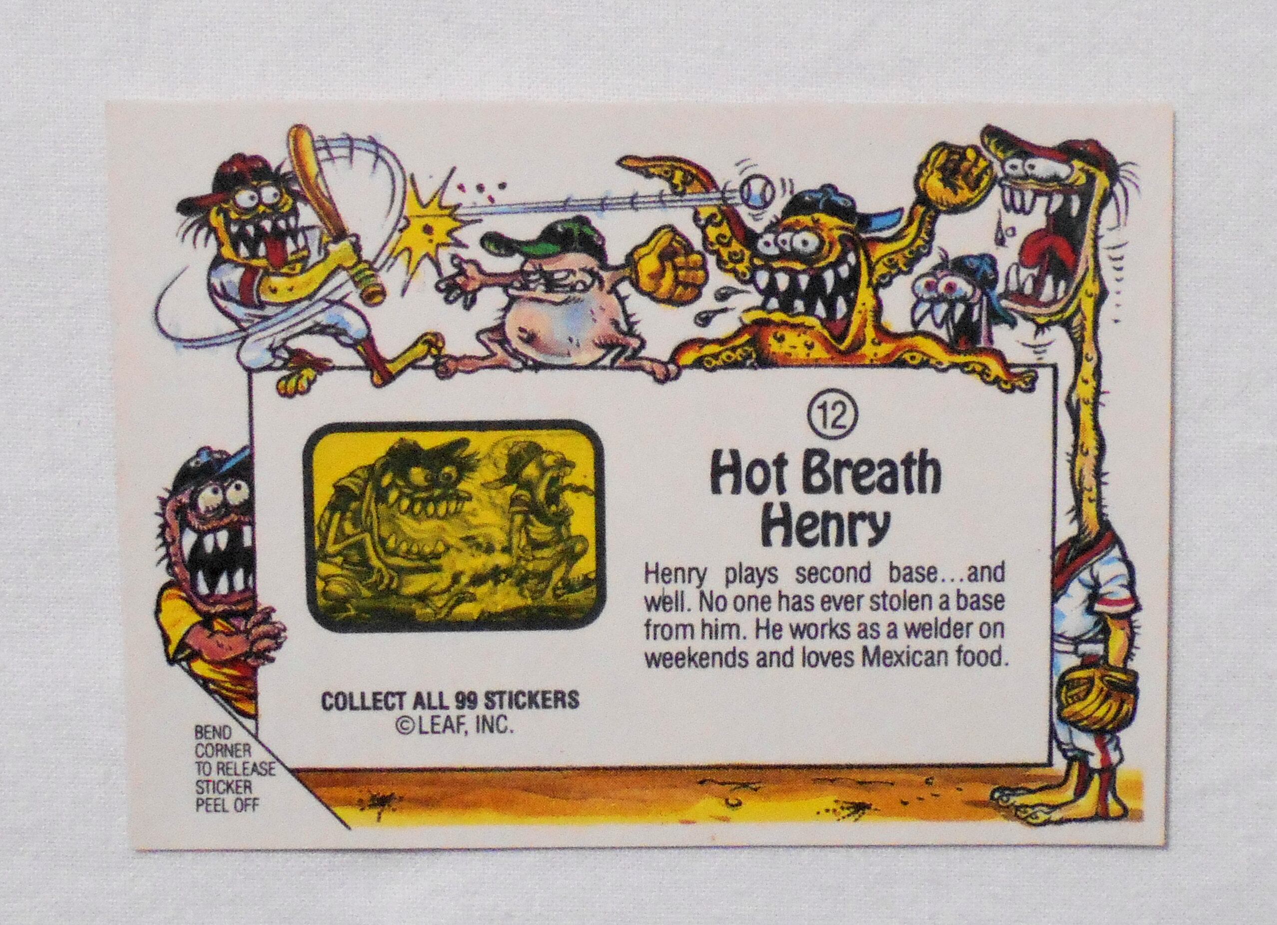 【NO.12-A HOT BREATH HENRY [AWESOME ALL STARS BASEBALL STICKERS & BUBBLE GUM]】◆大きさ約9×6.5センチ◆COPYRIGHT LEAF INC.◆MADE & PRINTED IN USA◆カード裏は2種類、モンスターの説明をしているものと、全種集めれば1枚の大きなポスターになるものがあり、当店の在庫管理の都合上、タイトル欄に前者をA、後者をBとさせて頂いております。メーカー公式のものではございません。