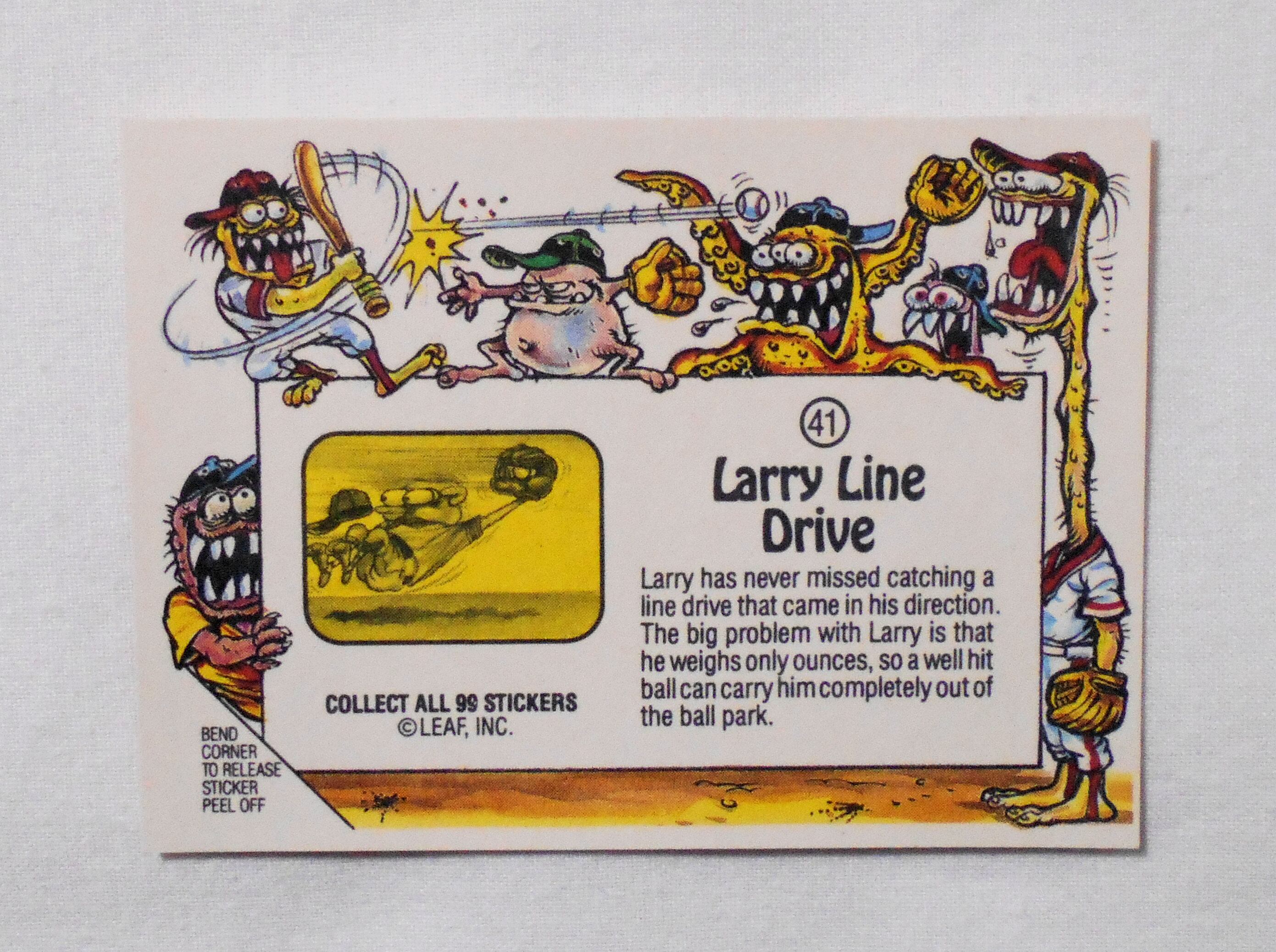【NO.41-A LARRY LINE DRIVE [AWESOME ALL STARS BASEBALL STICKERS & BUBBLE GUM]】◆大きさ約9×6.5センチ◆COPYRIGHT LEAF INC.◆MADE & PRINTED IN USA◆カード裏は2種類、モンスターの説明をしているものと、全種集めれば1枚の大きなポスターになるものがあり、当店の在庫管理の都合上、タイトル欄に前者をA、後者をBとさせて頂いております。メーカー公式のものではございません。