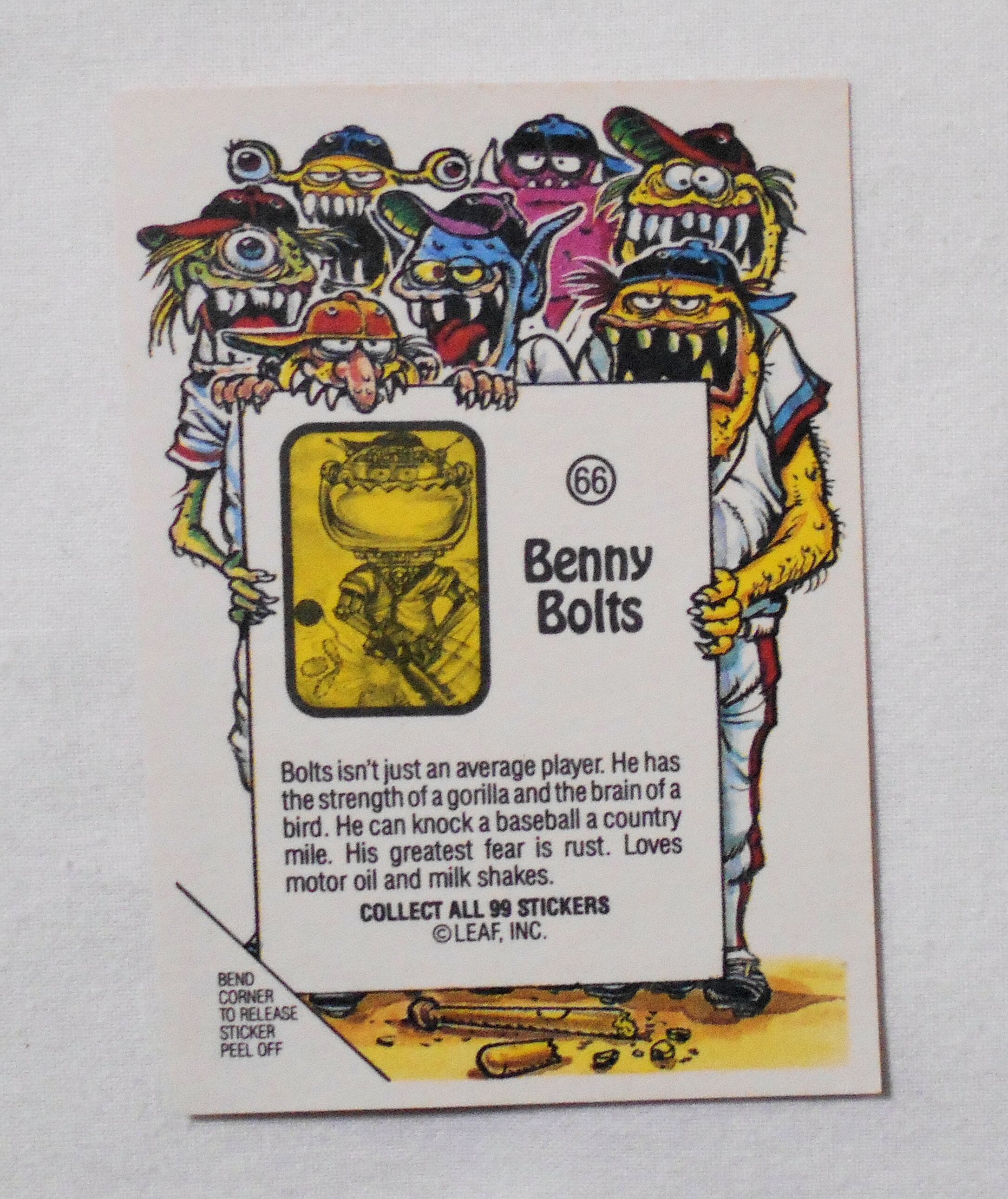 【NO.66-A BENNY BOLTS [AWESOME ALL STARS BASEBALL STICKERS & BUBBLE GUM]】◆大きさ約9×6.5センチ◆COPYRIGHT LEAF INC.◆MADE & PRINTED IN USA◆カード裏は2種類、モンスターの説明をしているものと、全種集めれば1枚の大きなポスターになるものがあり、当店の在庫管理の都合上、タイトル欄に前者をA、後者をBとさせて頂いております。メーカー公式のものではございません。