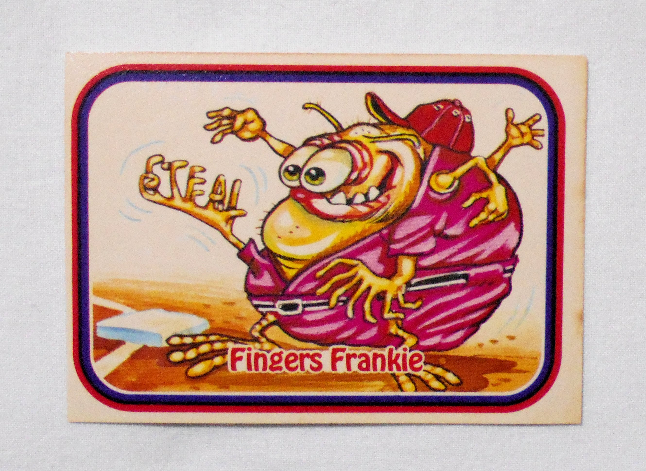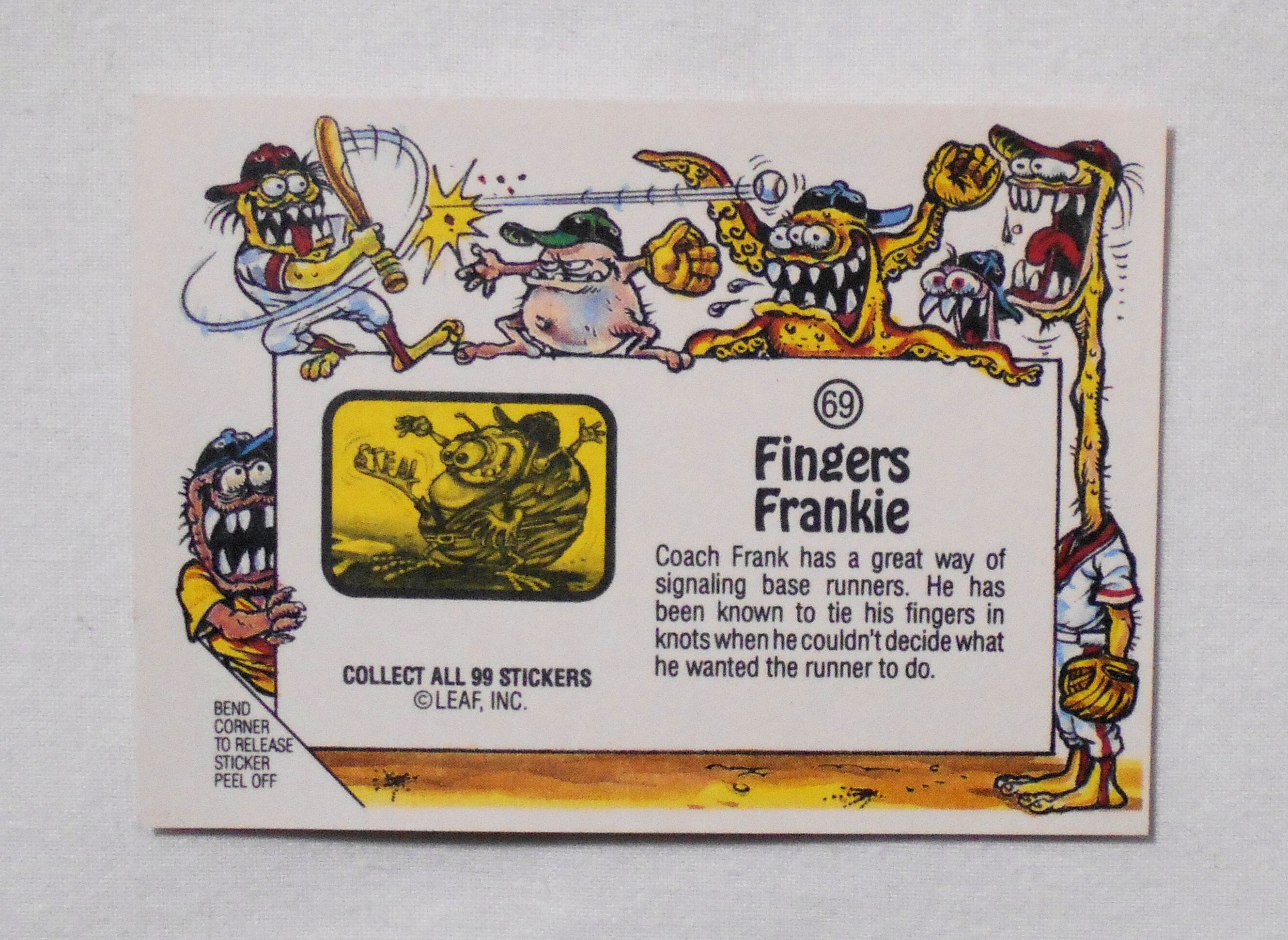 【NO.69-A FINGERS FRANKIE [AWESOME ALL STARS BASEBALL STICKERS & BUBBLE GUM]】◆大きさ約9×6.5センチ◆COPYRIGHT LEAF INC.◆MADE & PRINTED IN USA◆カード裏は2種類、モンスターの説明をしているものと、全種集めれば1枚の大きなポスターになるものがあり、当店の在庫管理の都合上、タイトル欄に前者をA、後者をBとさせて頂いております。メーカー公式のものではございません。