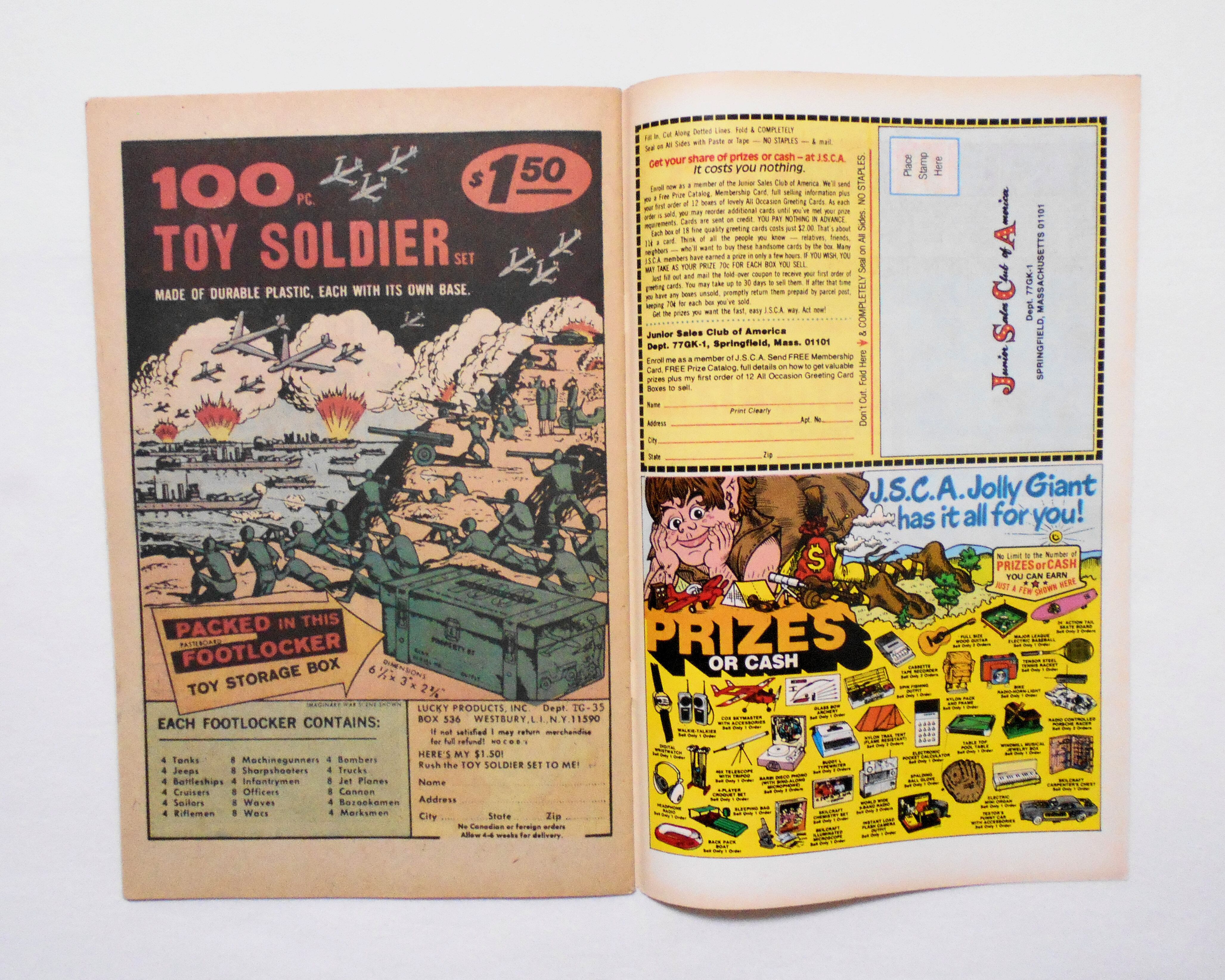 断裁がやや上寄りにズレており、中央見開きページの印刷部分の上端が僅かに切れています。コミックページは問題なく、すべて読むことが出来ます。他、多少の擦れやシワ、黄ばみ、紙ジミ、角や端の傷みや折れ、微破れ等があり、経年に伴う使用感は否めませんが、目立った汚れやシミ等はなく、1970年代の輸入中古コミックですので、その点を考慮頂ければ、普通程度~おおむねきれいな状態だと思います。新品同様の美品をお求めの方や、中古品にご理解が頂けない方にはお薦め出来ません。