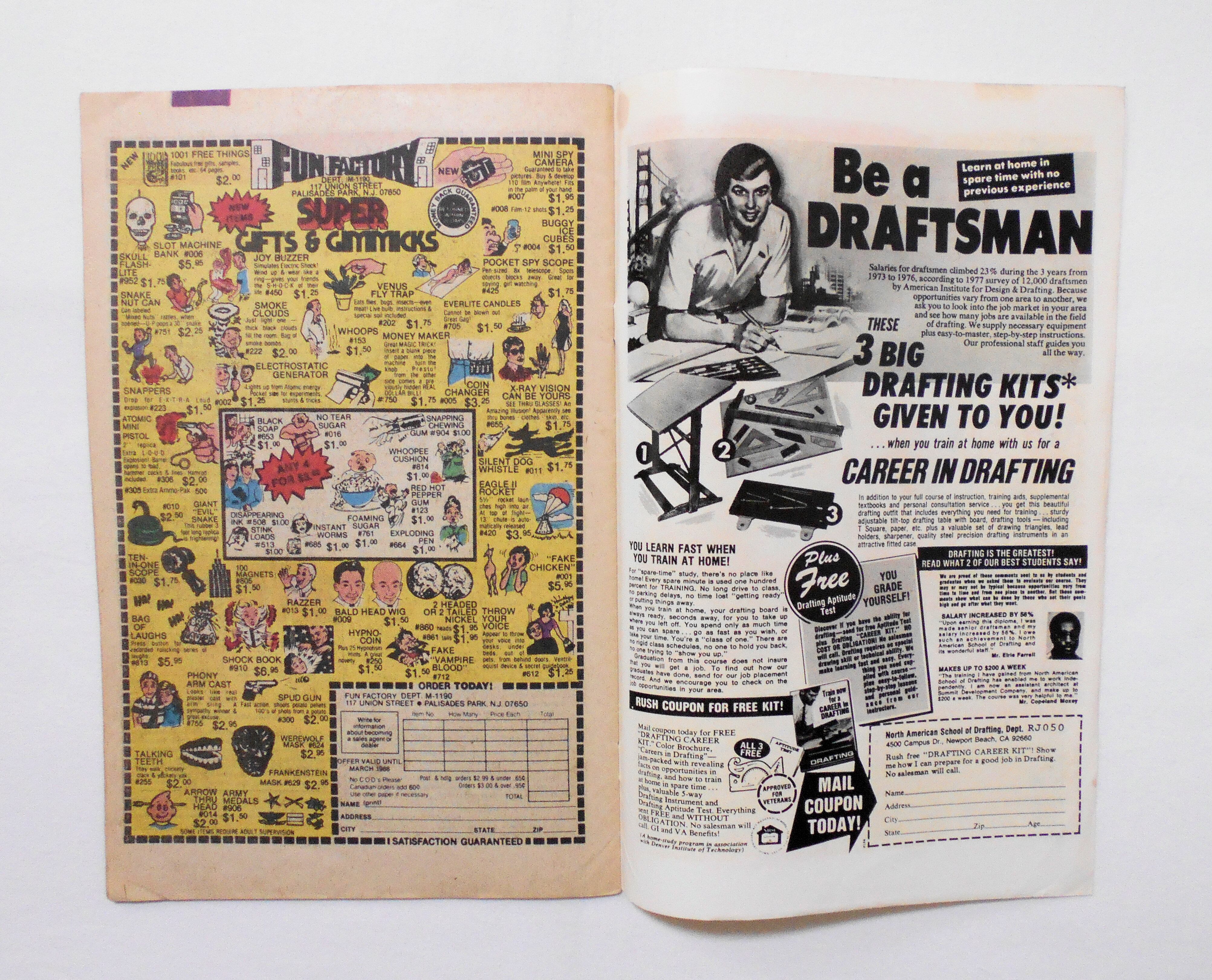 表紙のシワや折れがやや目立ちます。他、多少の擦れや黒ずみ、シワ、黄ばみ、角や端の傷みや折れ等があり、経年に伴う使用感は否めませんが、1980年代の輸入中古コミックですので、その点を考慮頂ければと思います。中は目立った汚れやシミ等はなく、おおむねきれいな状態ですので、読むのに支障はございません。新品同様の美品をお求めの方や、中古品にご理解を頂けない方にお薦めは出来ません。