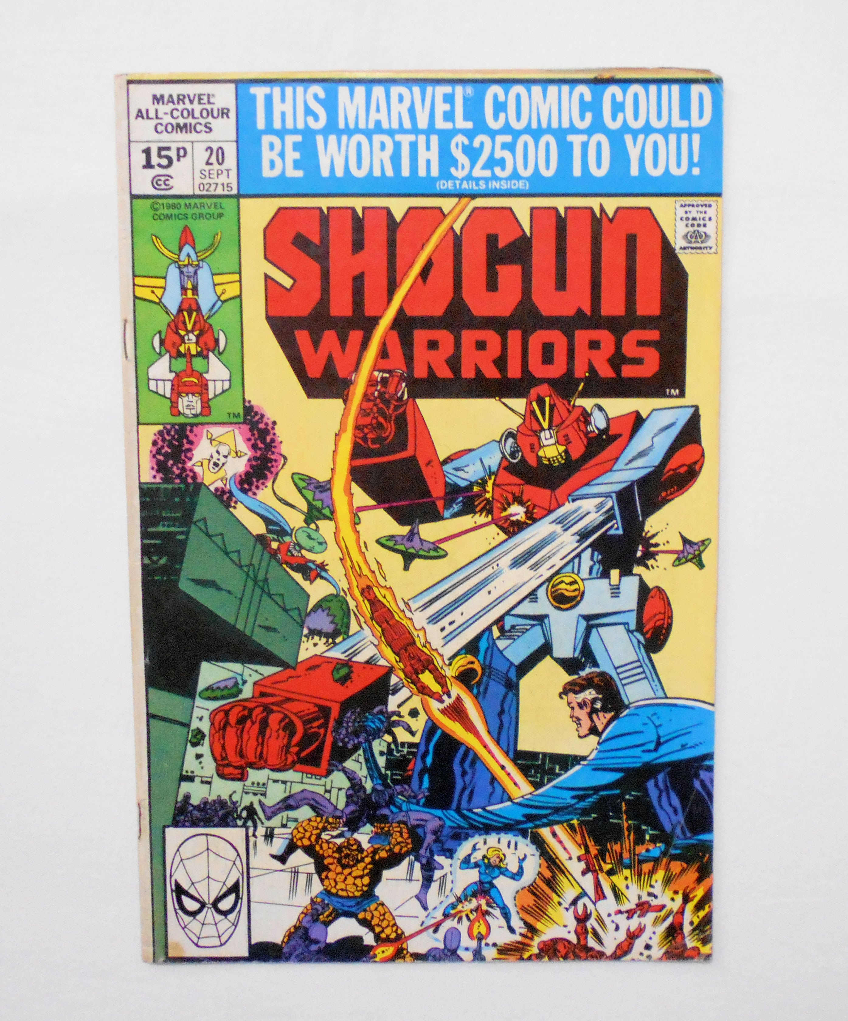 【SHOGUN WARRIORS ショーグン・ウォリアーズ】 VOL.1 N0.20 SEPT. 1980◆#19とこの最終号の#20には、ゲストにファンタスティック・フォーが登場します。連載当初に比べ、発行部数が減ってきたことに加え、ファンタステック4との異色のクロスオーバーということで後年徐々にプレミアム化し、シリーズ中最も入手困難で、ダントツのプレミアム価格で取り引きされている#20です。◆中古アメリカン・コミック。英文表記の洋書となります。◆32ページ カラー 大きさ約26×17センチ◆MARVEL COMIC GROUP◆HIROMI PRO/TOEI(東映)◆REIJI MATSUMOTO(松本零士)/TOEI ANIMATION(東映アニメーション)◆TOHOKUSHINSHA(東北新社)◆MATTEL,INC.◆米トイ・メーカー<マテル社>から発売された超合金シリーズ『ショーグン・ウォリアーズ』の人気にあやかり、マーベルより出版されたコミック・シリーズ。『惑星ロボ ダンガードA』、『勇者ライディーン』、『超電磁ロボ コン・バトラーV』が登場しますが、日本のアニメとは設定等が大幅に変更されたオリジナル・ストーリーです。◆イギリスで販売されたもので、アメリカ版との違いは、表紙の左上角に記載された値段表記の部分だけだと思います。